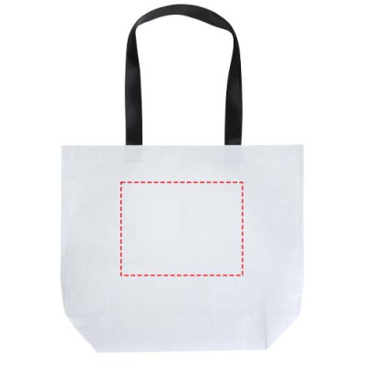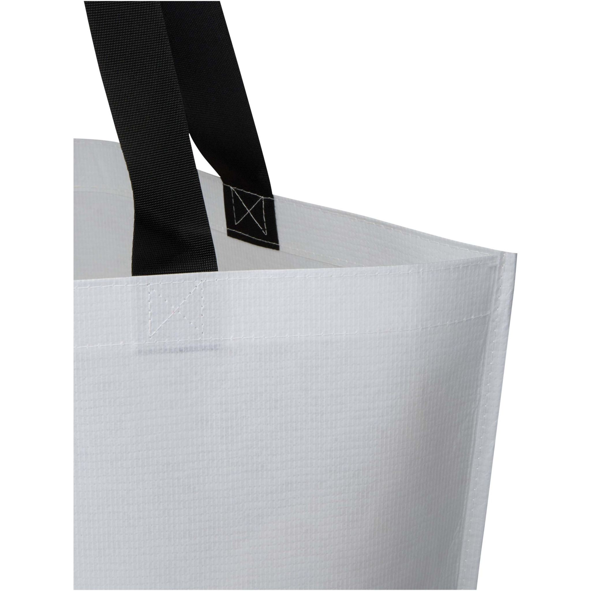 Die übergroße Duo Tragetasche mit doppelt laminiertem Boden besteht aus 150 g/m2 GRS zertifiziertem RPET und bietet verbesserte Haltbarkeit und Wasserbeständigkeit, wenn es darauf ankommt. Sie verfügt über ein geräumiges offenes Hauptfach, robuste, verstärkte Griffe und einen breiten Boden für zusätzliches Fassungsvermögen. Sie ist für eine Traglast von bis zu 15 kg ausgelegt und stellt somit eine stilvolle und zuverlässige Option für den Lebensmitteleinkauf, Strandausflüge, Picknicks oder Wochenendtrips dar. Fassungsvermögen: 30 Liter.