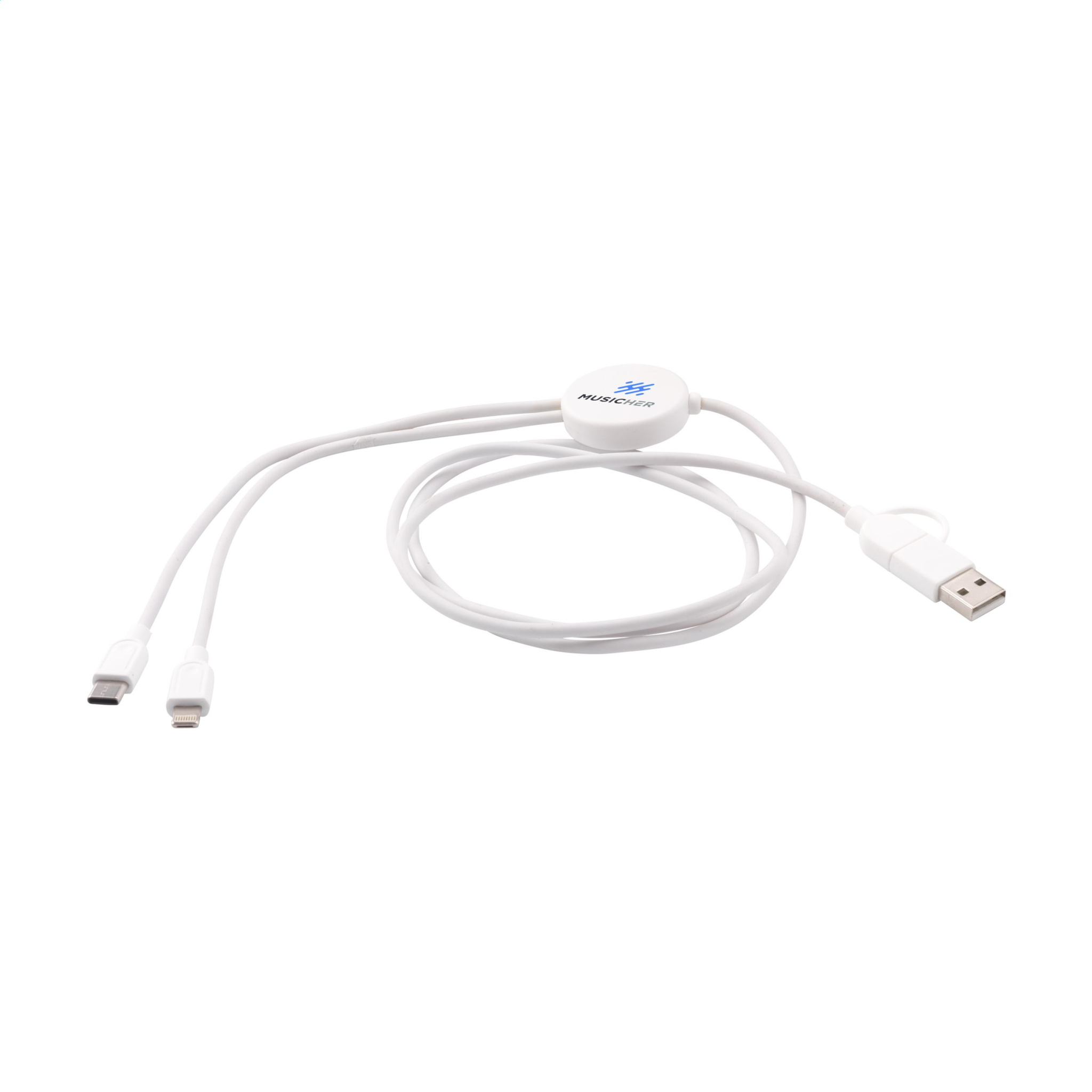 Ladekabel aus recyceltem ABS und recyceltem TPE. Eingang: Typ-C- und USB-A-Anschluss. Ausgang: Typ-C und Lightning. RCS-zertifiziert. Gesamtanteil recycelten Materials: 62 %. Kabellänge: 120 cm. Jeder Artikel wird in einem einzelnen Umschlag geliefert.