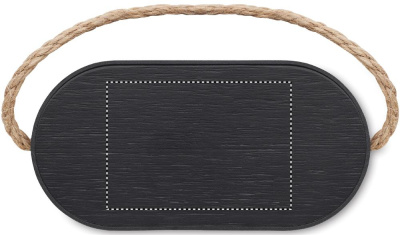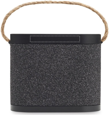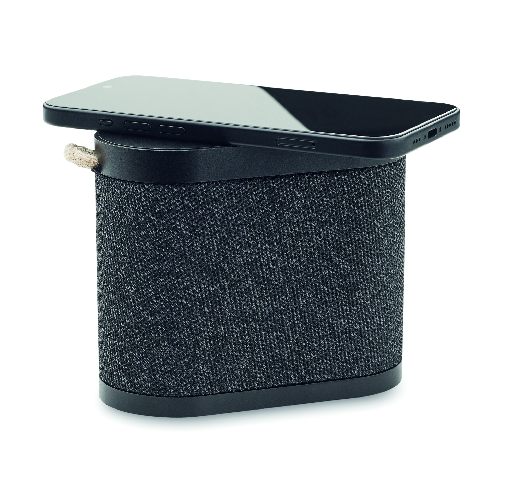 5.3 wireless Lautsprecher mit 15W kabelloser Ladestation. ABS mit RPET-Polyester-Gewebe und schwarz beschichtetem Bambus. Jutegriff. Eingebauter Li-Ion-Akku: 1200 mAh. Ausgangsdaten: 5W, 4 Ohm und 5V. Spielzeit ca. 4 Stunden.