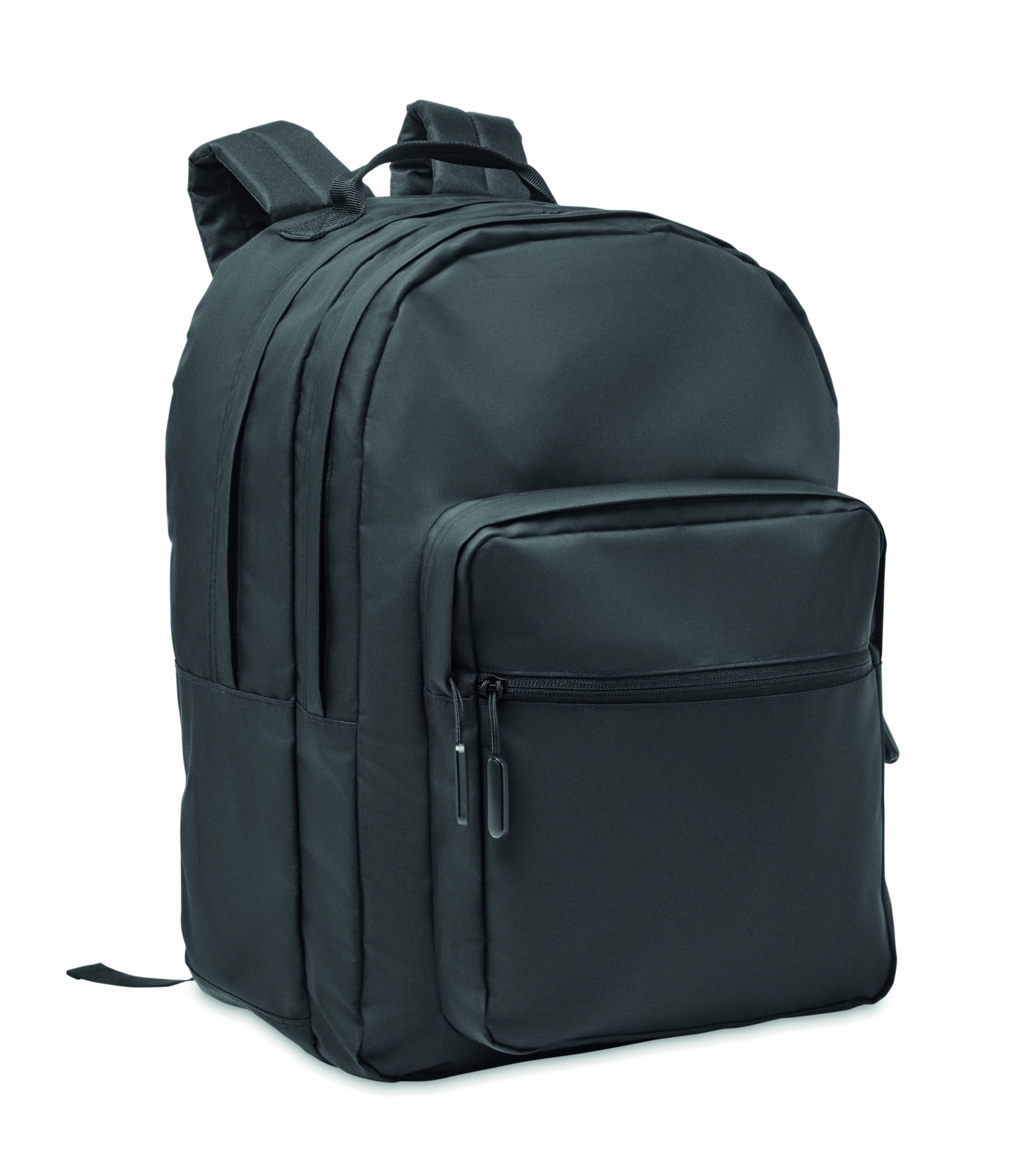 15'' Laptop-Rucksack aus 300D RPET-Polyester. Mit 2 großen Reißverschlussfächern, Taschen mit 2fach Reißverschluss auf der Vorderseite und seitlichen Netztaschen. Gepolsterte Rückseite, Boden und gepolsterte Schultergurte.