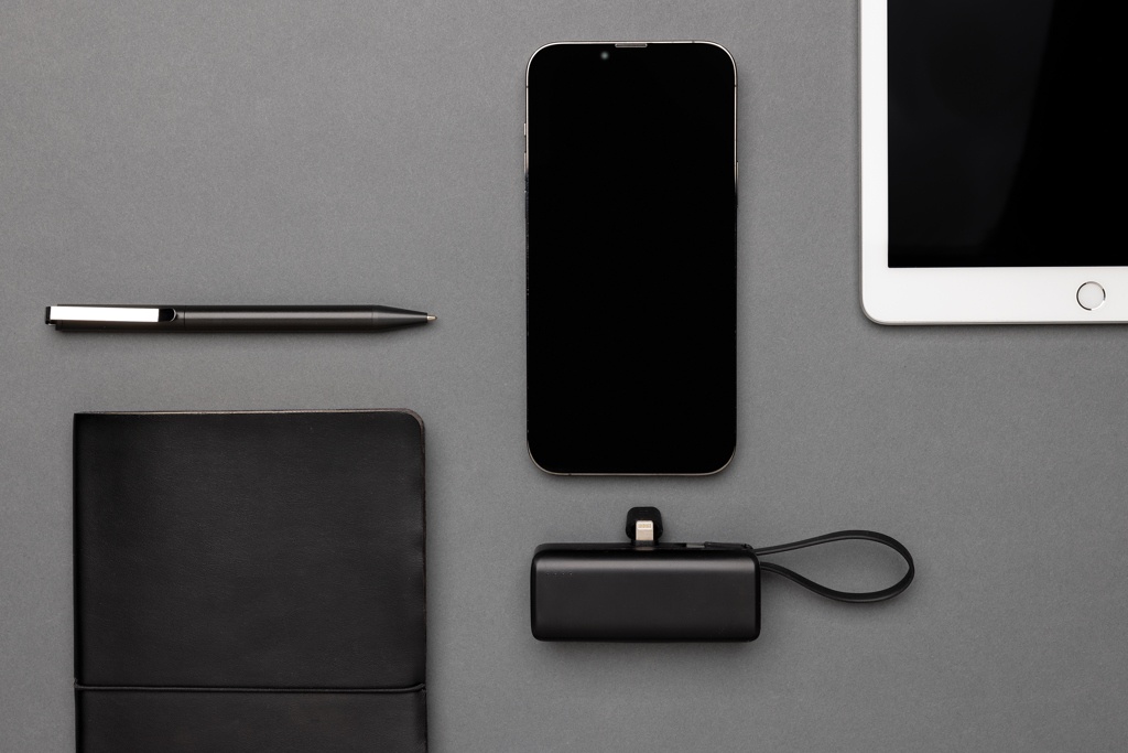 Tragbare Powerbank im Taschenformat, die Sie leicht mitnehmen können. Die Powerbank wird mit einem Lightning-Stecker geliefert, den Sie an Ihr iPhone anschließen können, um den Ladevorgang direkt zu starten. Die 3.000mAh-Powerbank verfügt außerdem über ein integriertes USB-C-Eingangs- und Ausgangskabel, das zum Aufladen anderer USB-C-Geräte und zum Wiederaufladen der Powerbank verwendet werden kann, so brauchen keine Kabel mit sich zu führen, um diese Powerbank zu verwenden oder wieder aufzuladen. Hergestellt aus recyceltem ABS und recyceltem TPE. Gesamter recycelter Inhalt: 19% basierend auf dem Gesamtgewicht des Artikels. Die RCS-Zertifizierung gewährleistet eine vollständig zertifizierte Lieferkette der recycelten Materialien. Verpackt in FSC®-Verpackung. PVC-frei. Eingang: 5V/2.1A Ausgang 5V/2.4A.