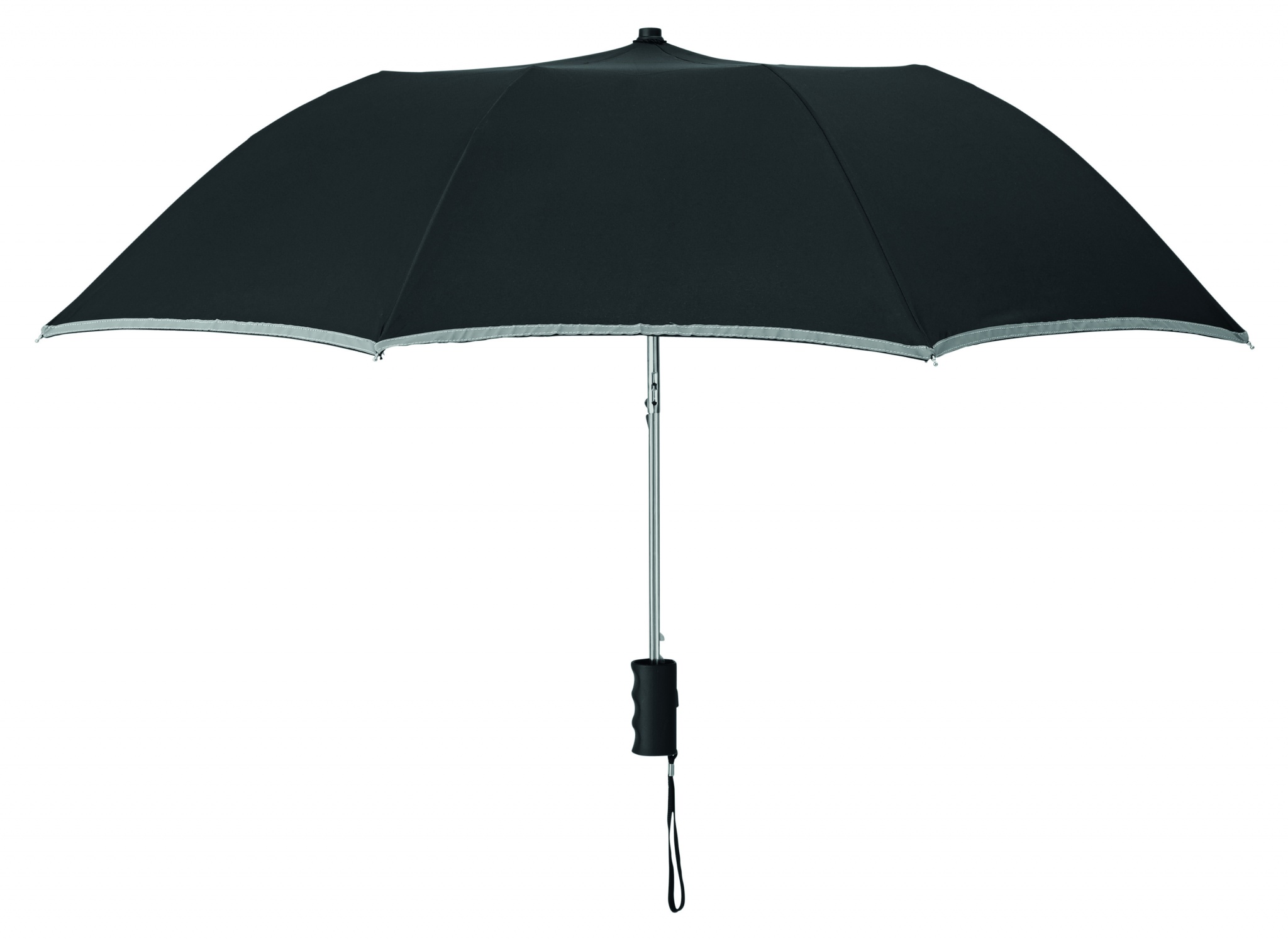 21'' Regenschirm aus 190T Seide. 2-fach faltbar. Gestell aus verzinktem Stahl, Schienen und Spitzen. Segmente mit reflektierendem Rand. Schwarzer Griff aus Kunststoff mit Handschlaufe. Passende Schirmhülle. Automatische Öffnung, manuelle Schließung.