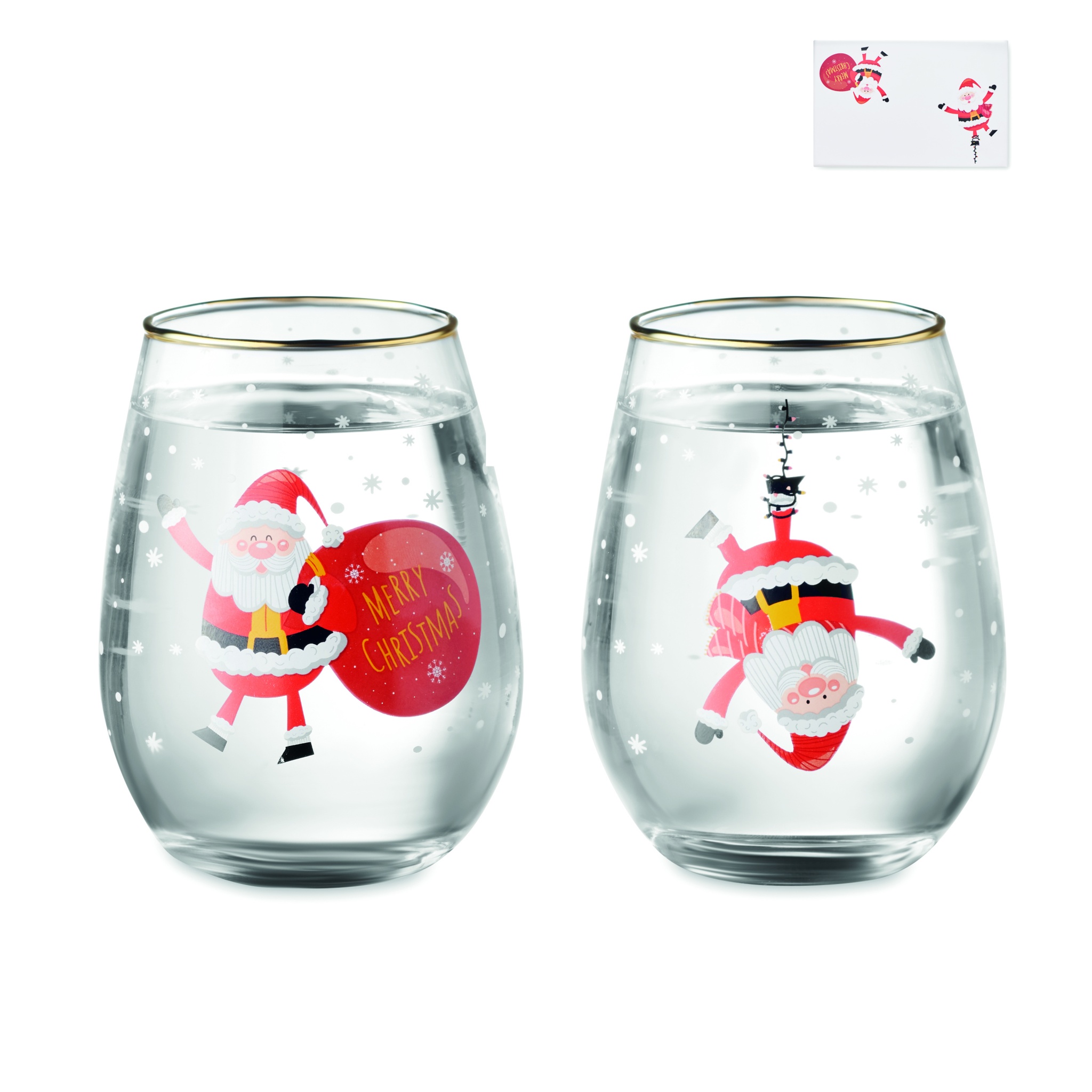 Set mit 2 Gläsern mit weihnachtlichem Dekor und Goldrand. Füllmenge: 330 ml. Lieferung in einer Geschenkbox.