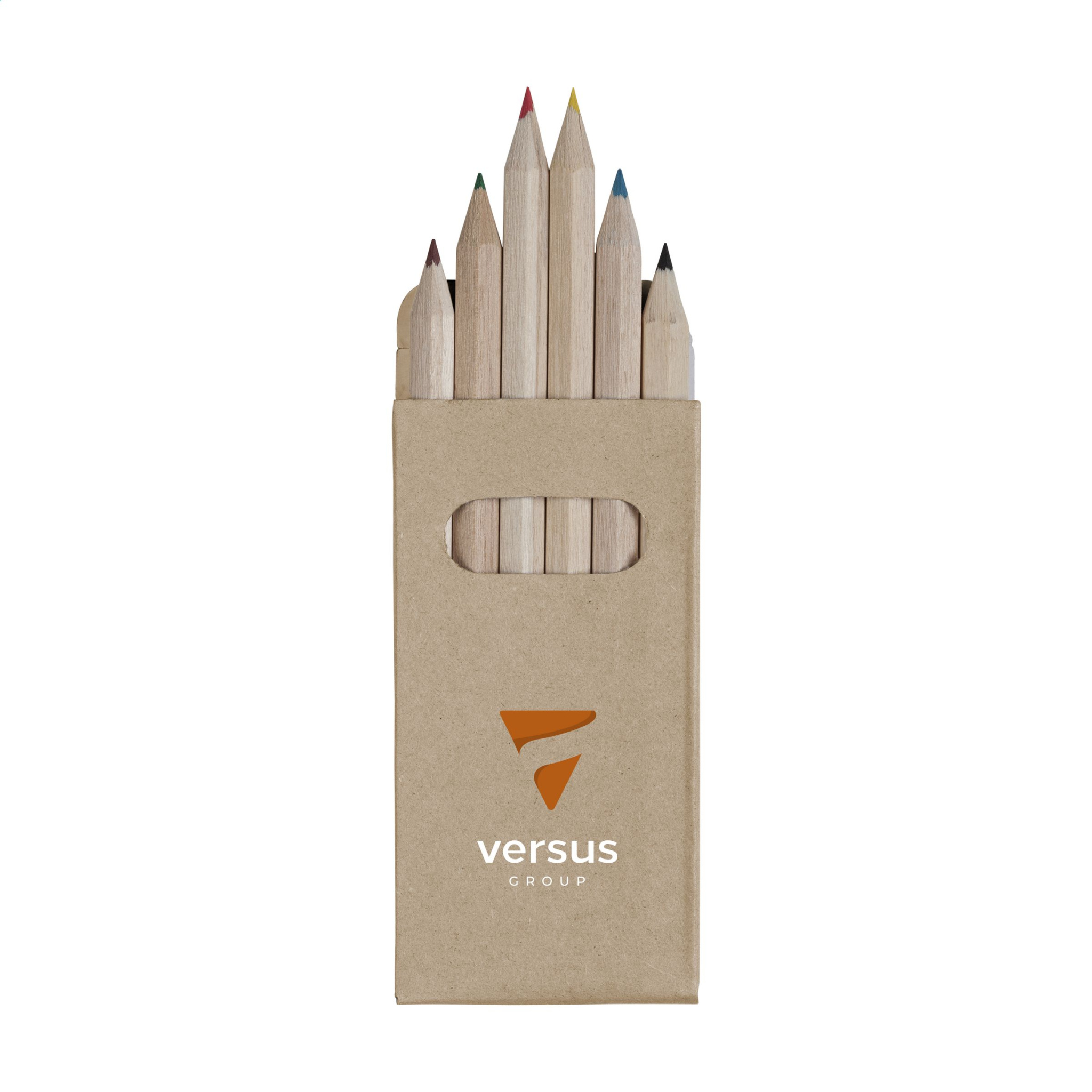 6 unbemalte Buntstifte aus Holz in einer Schachtel aus Recyclingkarton.