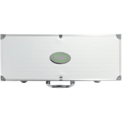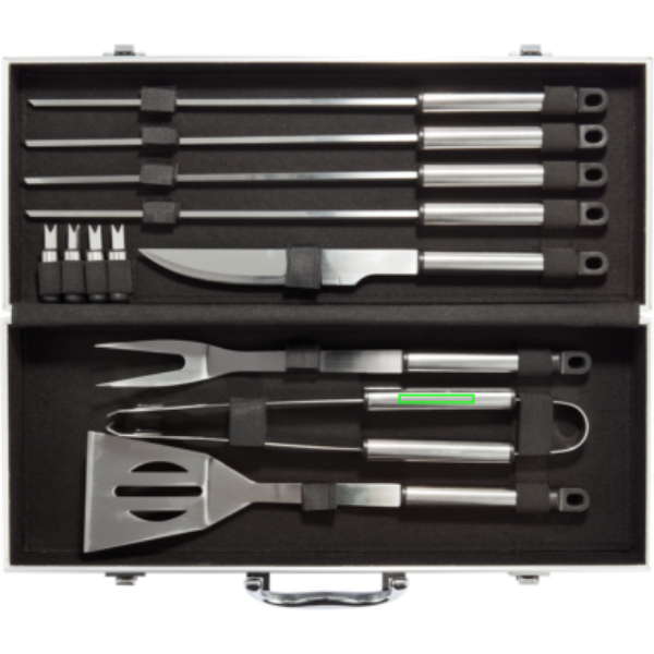 12 pcs stainless steel barbecue set, including 4 pcs skewers, carving knife, 4 corn holders, spatula, carving fork with protection cover and pair of tongs. Packed in aluminium case with hinges and handle.