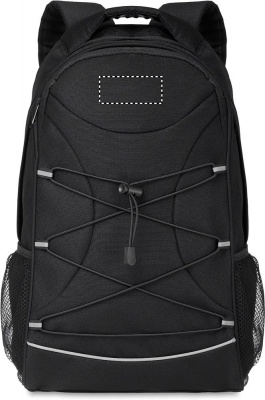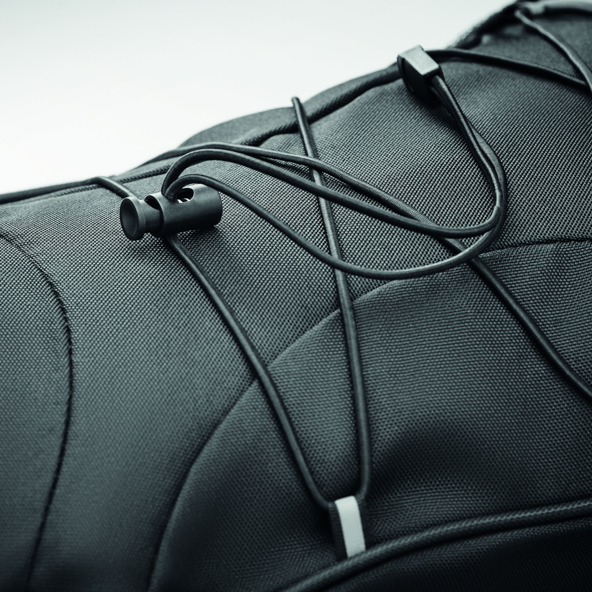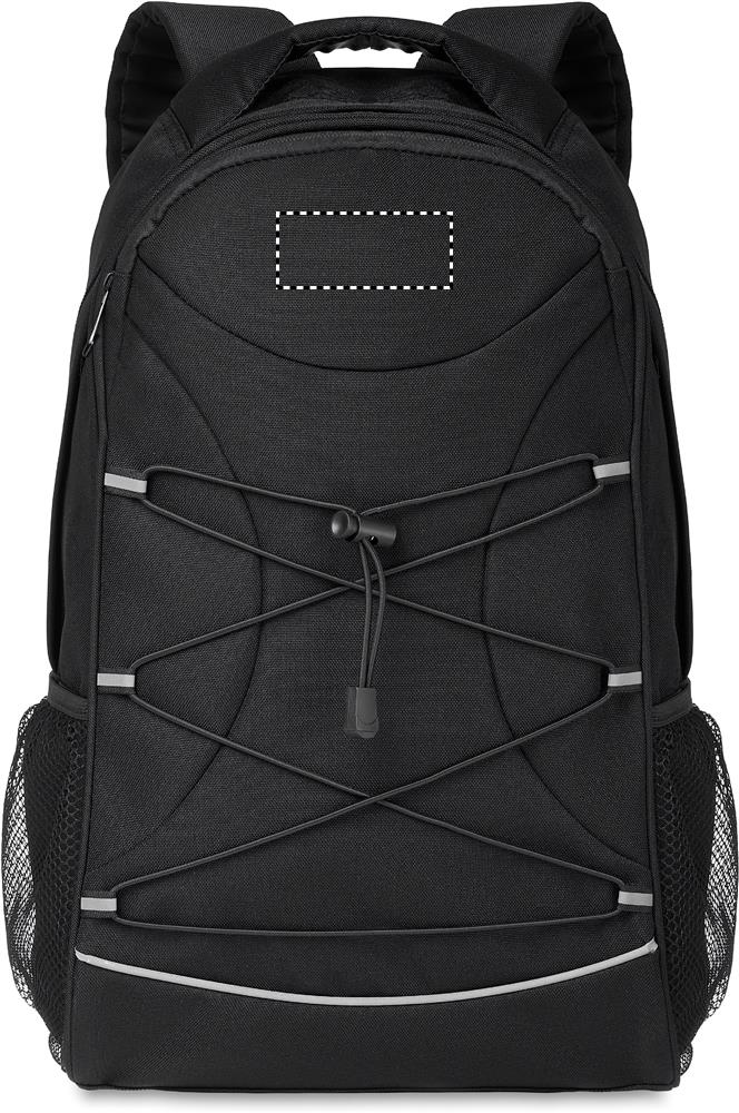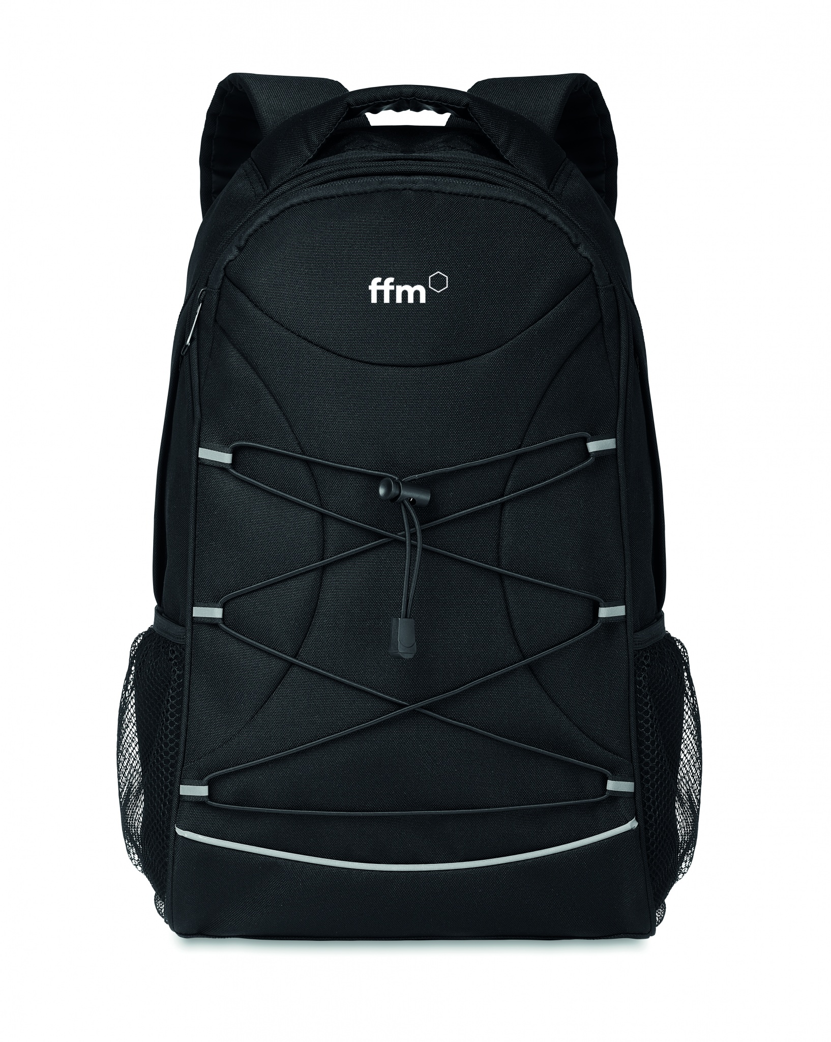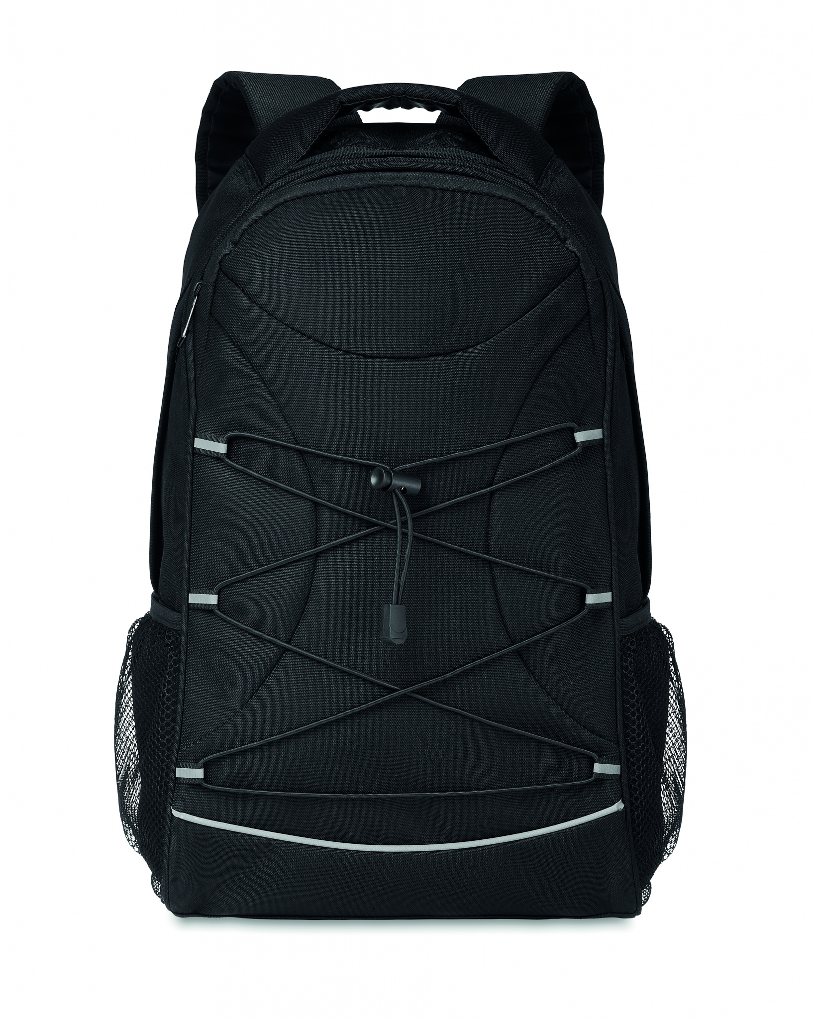 Backpack in 600D RPET with dark cords in front and reflective front panel feature. Mesh pockets on both sides.
