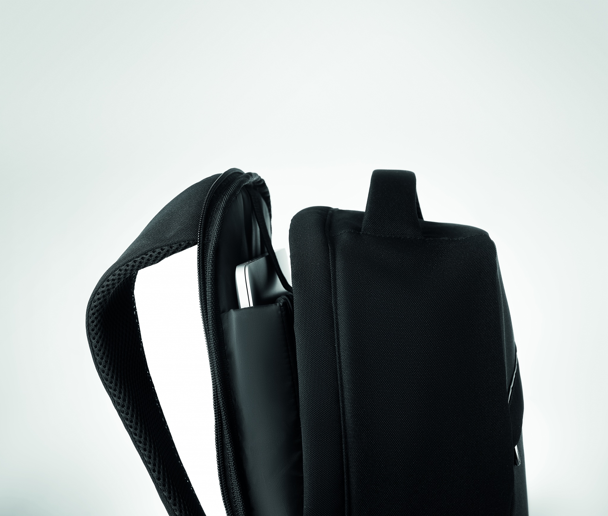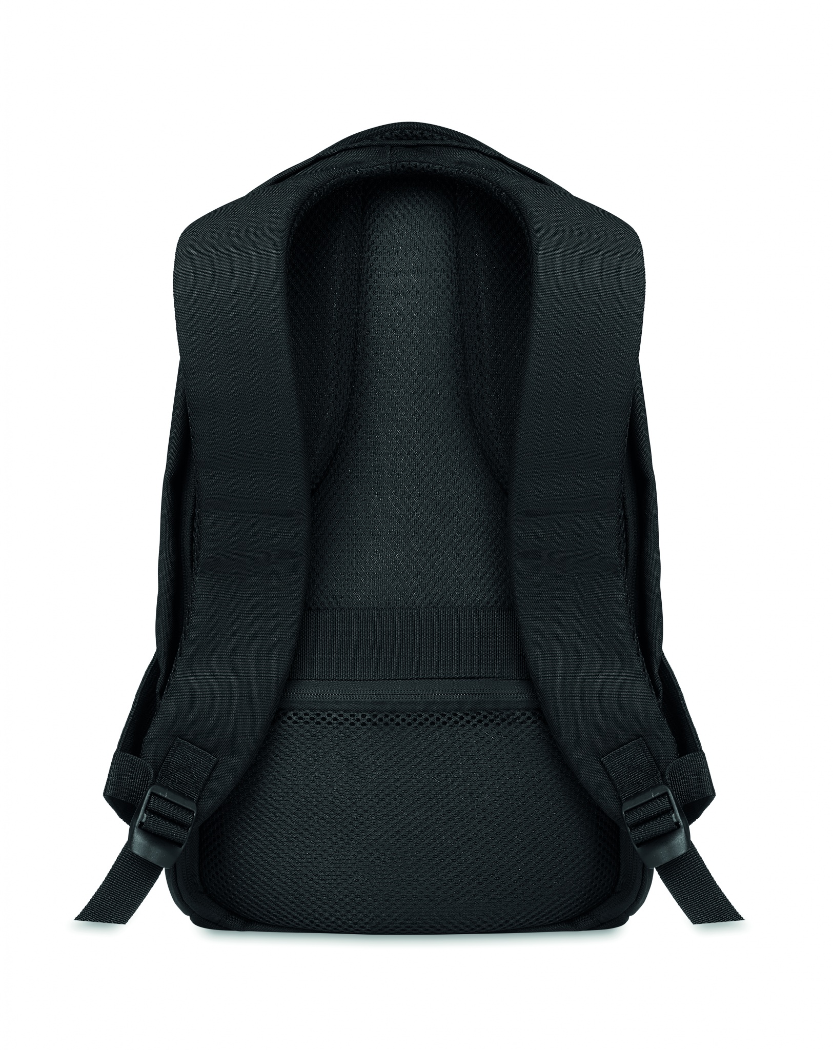 600D RPET backpack with padded shoulder strap with main internal compartment. It has a zippered front pocket. Includes one internal 13 inch laptop compartment. Zipper main compartment on backside for better security.