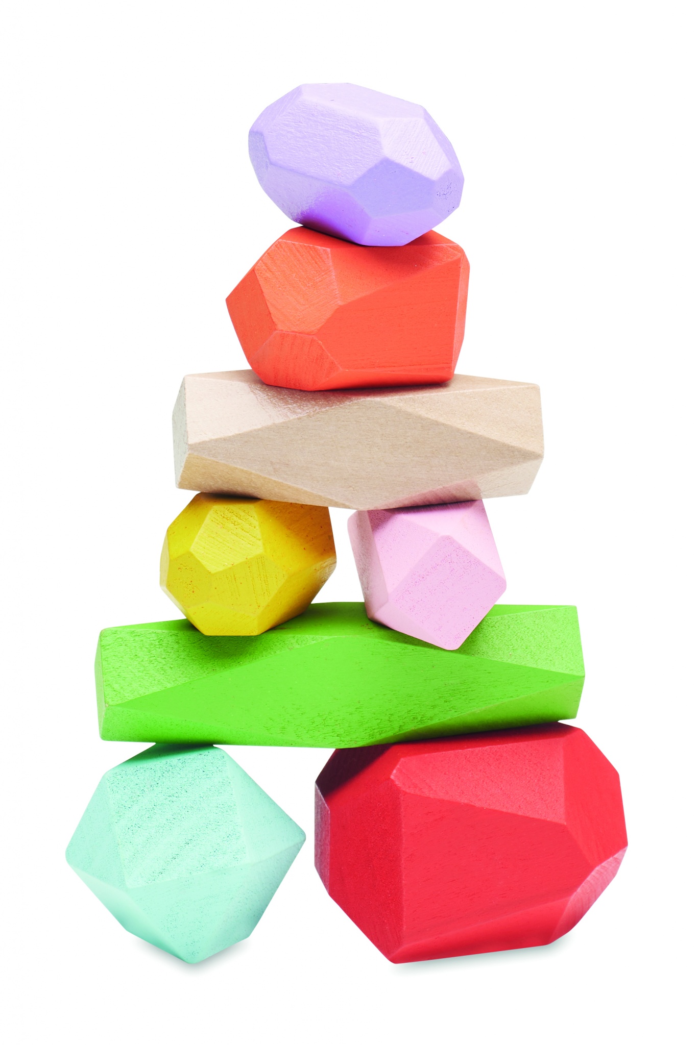 8 coloured wooden stacking rocks set in cotton drawcord pouch.