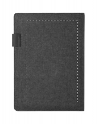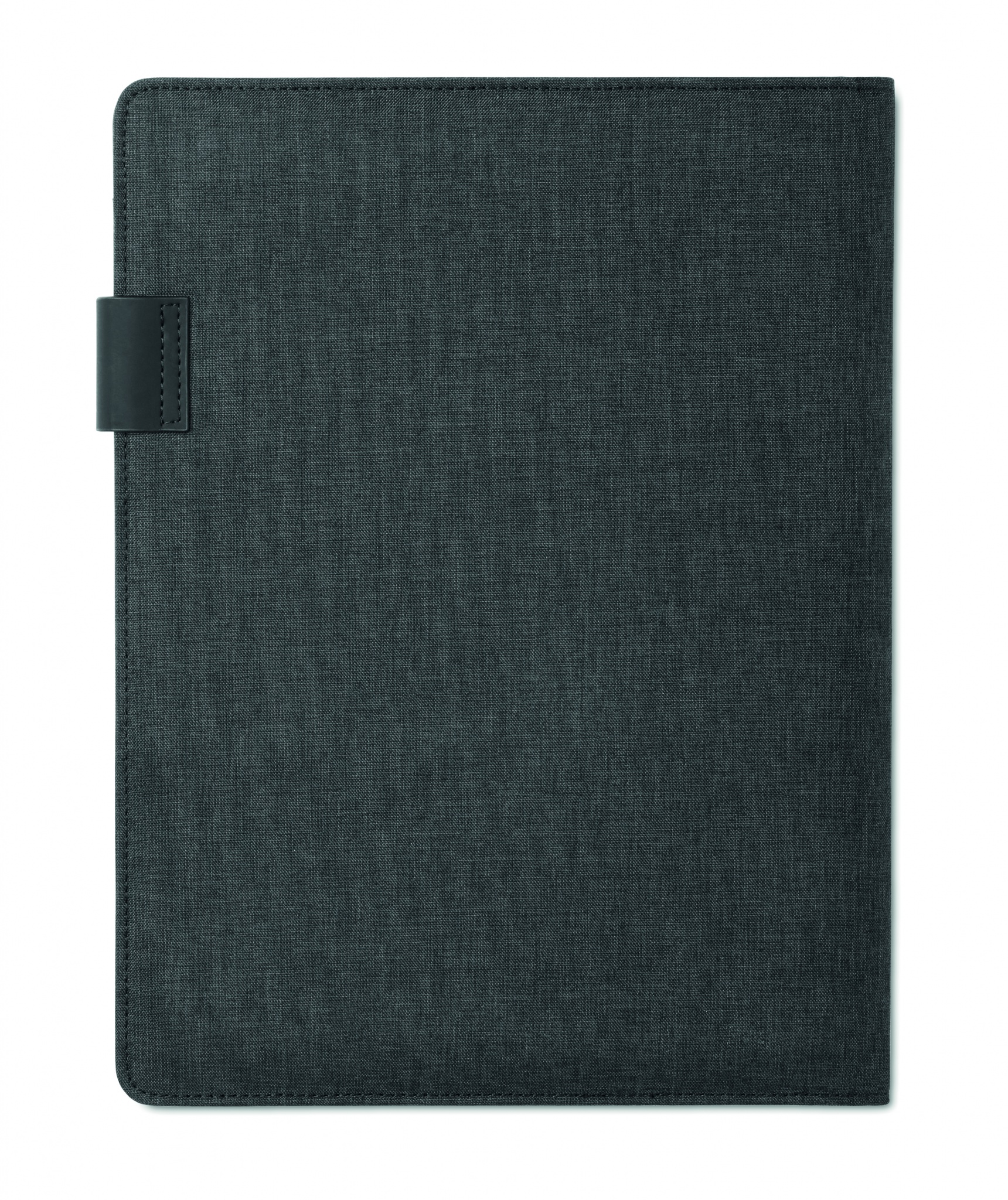 A4 conference folder with linen-PU cover. 4000 mAh power bank. Built-in micro USB to a Type C connector. 20 lined sheets notepad. Multiple internal compartments. Magnetic closure. Elastic pen holder.