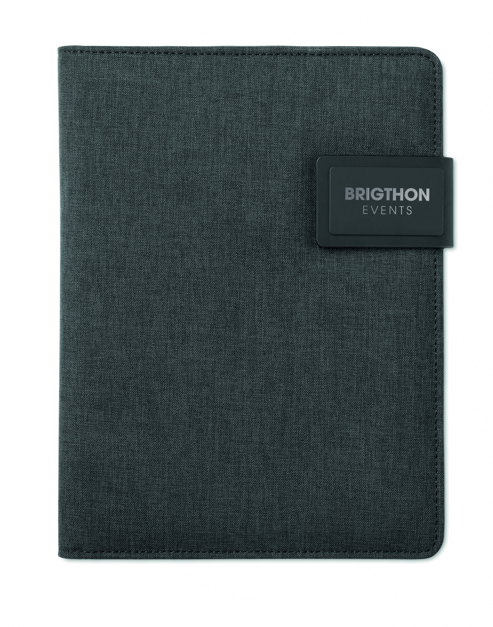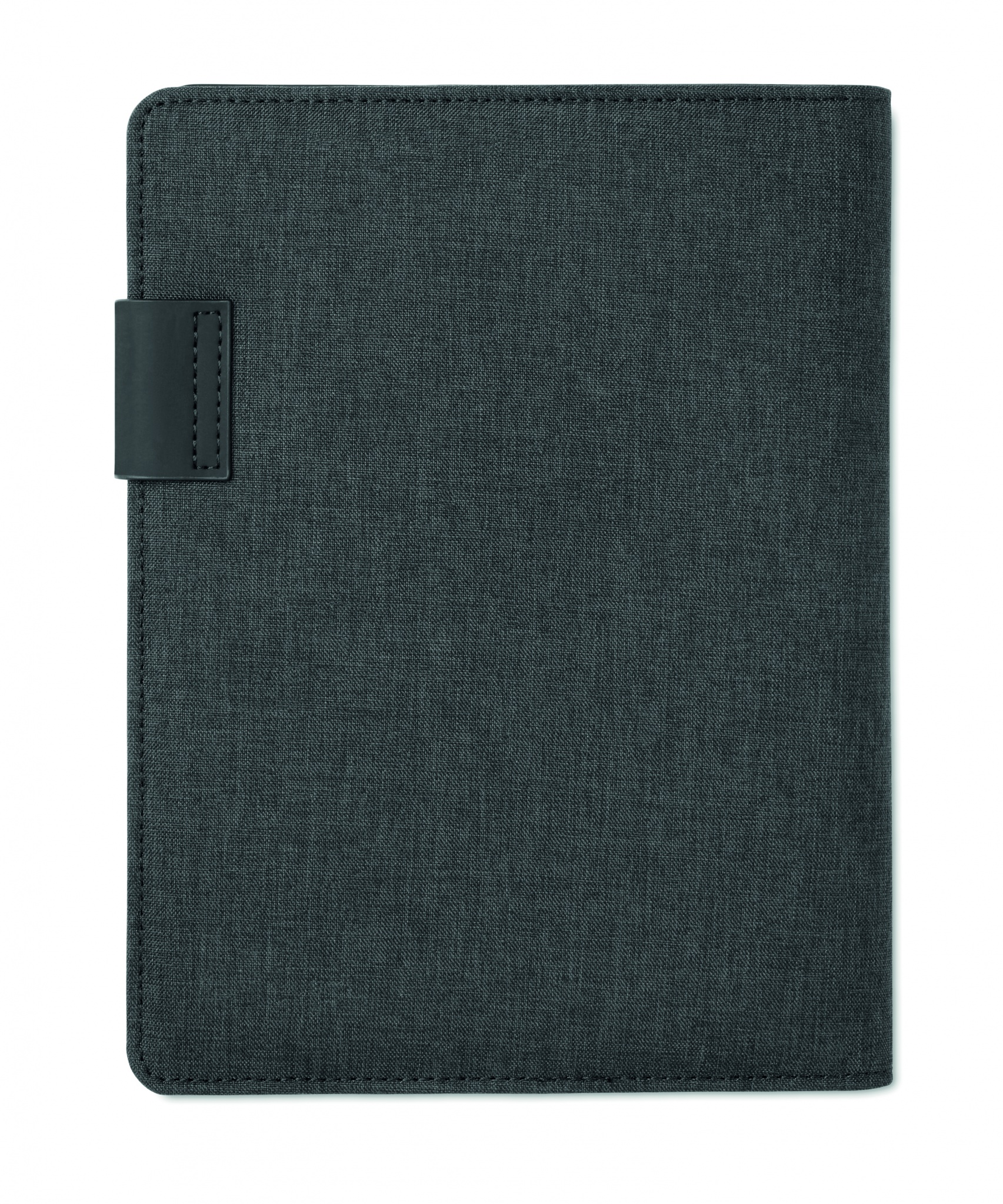 A5 conference folder with linen-PU cover. 4000 mAh power bank. Built-in micro USB to a Type C connector. 20 lined sheets notepad. Multiple internal compartments. Magnetic closure. Elastic pen holder.