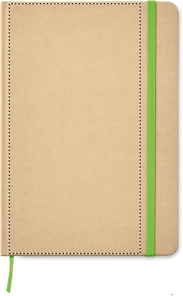 A5 notebook with hard recycled carton cover. Casebound. 160 lined pages (80 sheets). Elastic closure strap, ribbon bookmark.