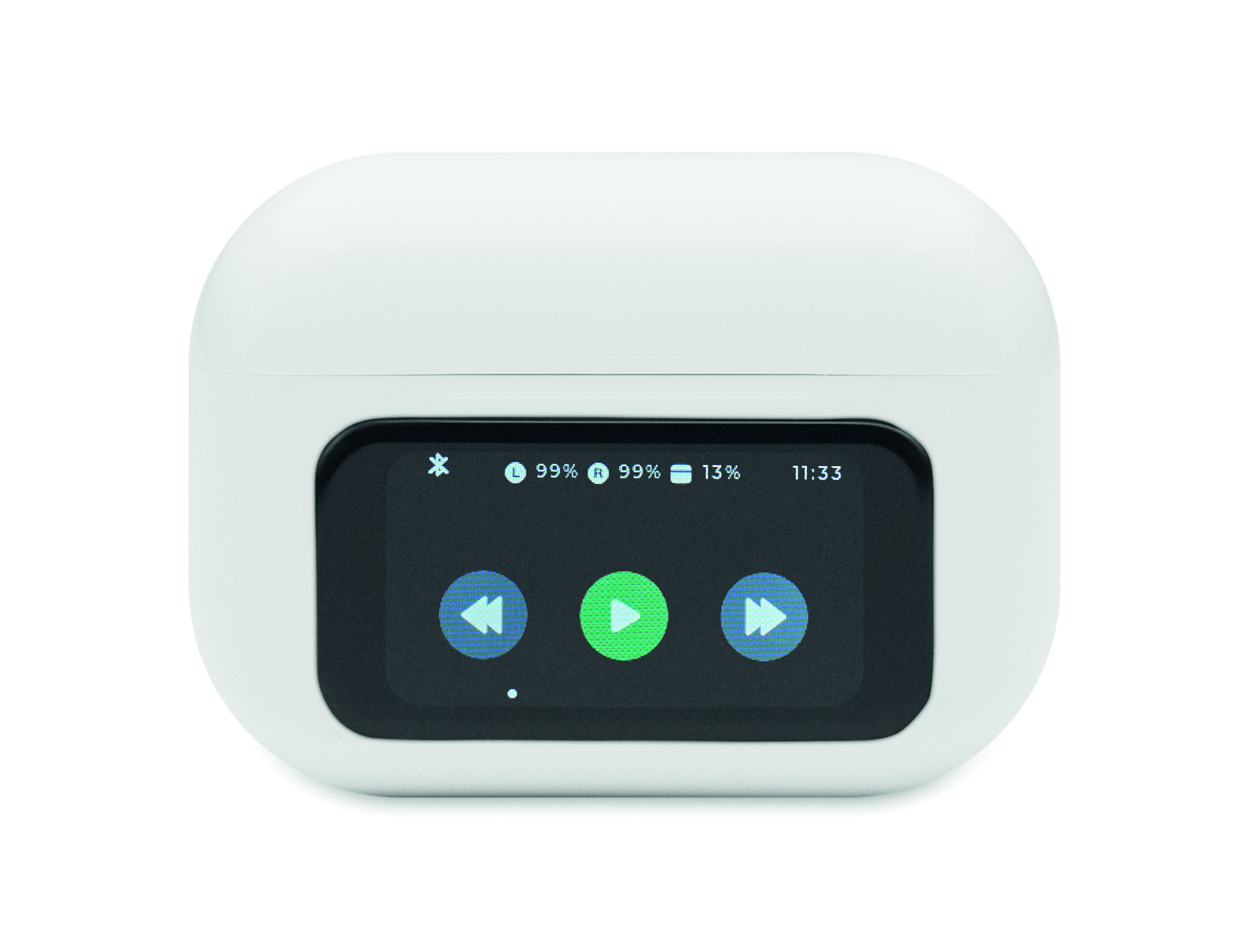 ABS True Wireless Stereo (TWS) 5.0 wireless stereo earbuds (30 mAh) with ANC/ENC and microphone and 230 mAh charging base. Touch screen control and display.