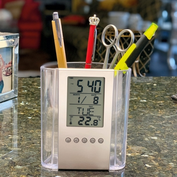 Acrylic desk pen holder with silvered front; features clock, alarm, date, day of the week, and room temperature (C / F) and includes a button cell battery. We will print your logo below the multifunction display.