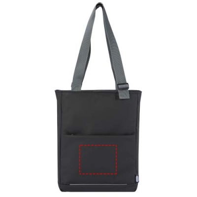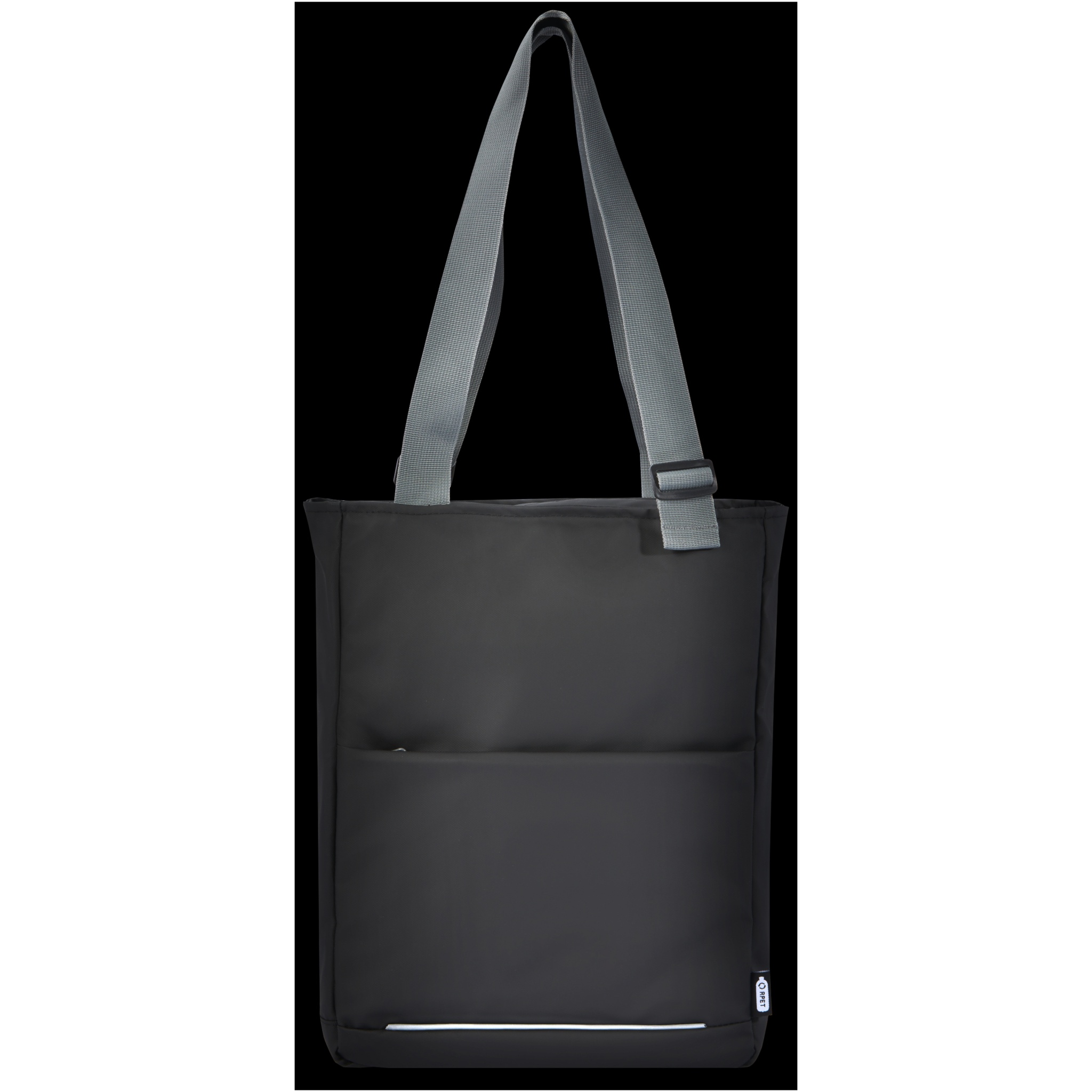 Water-resistant laptop tote bag made from GRS recycled materials, including the zips. It features a dedicated tablet sleeve, a 14” laptop compartment, multiple pockets for organization, a front pocket with organization panel, adjustable 35 cm long handles, and a luggage strap. The GRS recycled materials include the main fabric, lining, webbing, and zips. Capacity: 14 litres. PVC free.