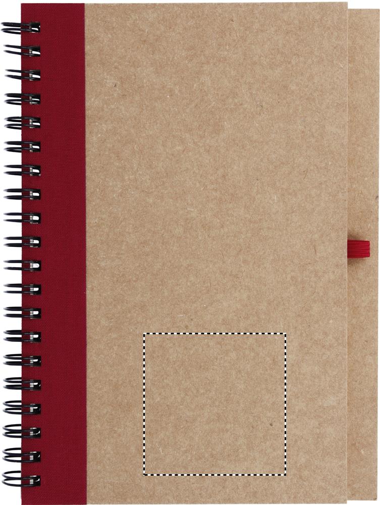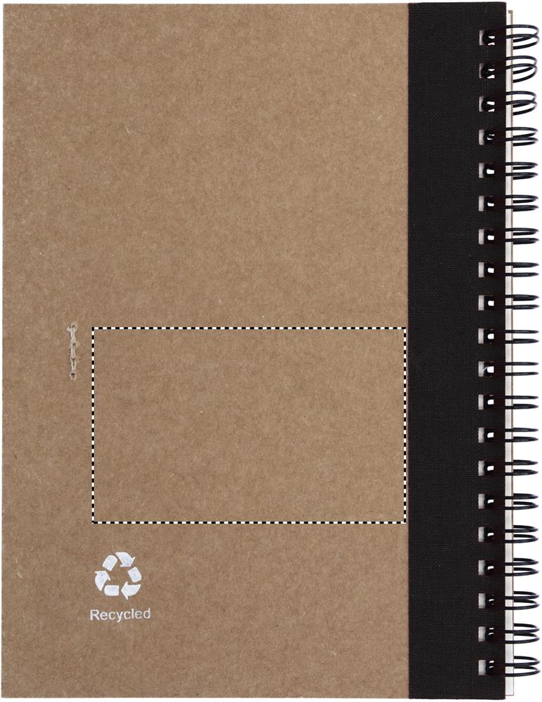 Recycled paper notebook with matching pen. Twin-wire. 140 plain recycled paper pages (70 sheets). Matching push button ball pen in recycled carton and biodegradable plastic. Blue ink. Matching elastic pen holder.