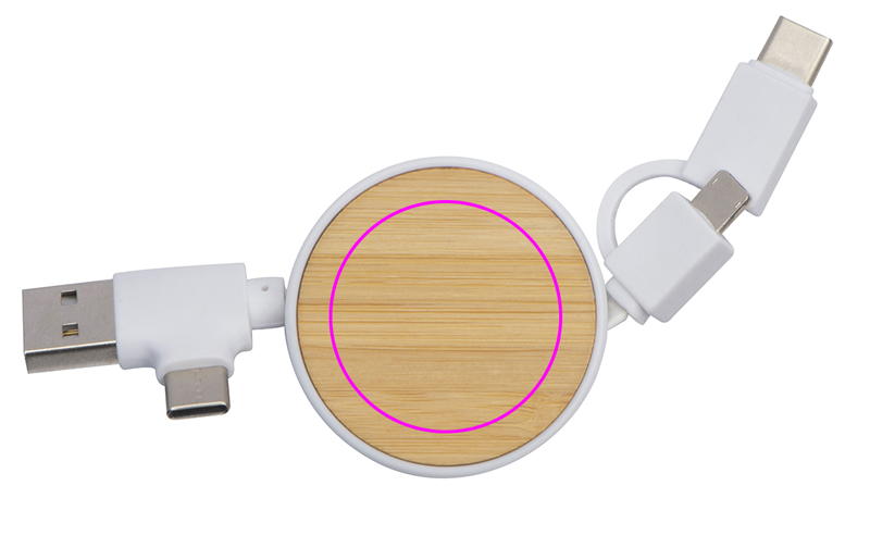 Extendable charging cable in a plastic housing with a bamboo plate, USB, 2 C-Type and an iOS adapter. Your logo will be printed onto the bamboo part.