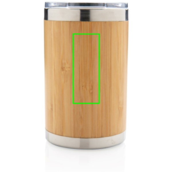 This unique bamboo coffee tumbler comes with 304 foodgrade and rustproof stainless steel interior walls and organic bamboo exterior. Perfect size to fit most coffee machines. Keep your drinks hot for up to 3h and cold for up to 6h. Content: 270 ml.