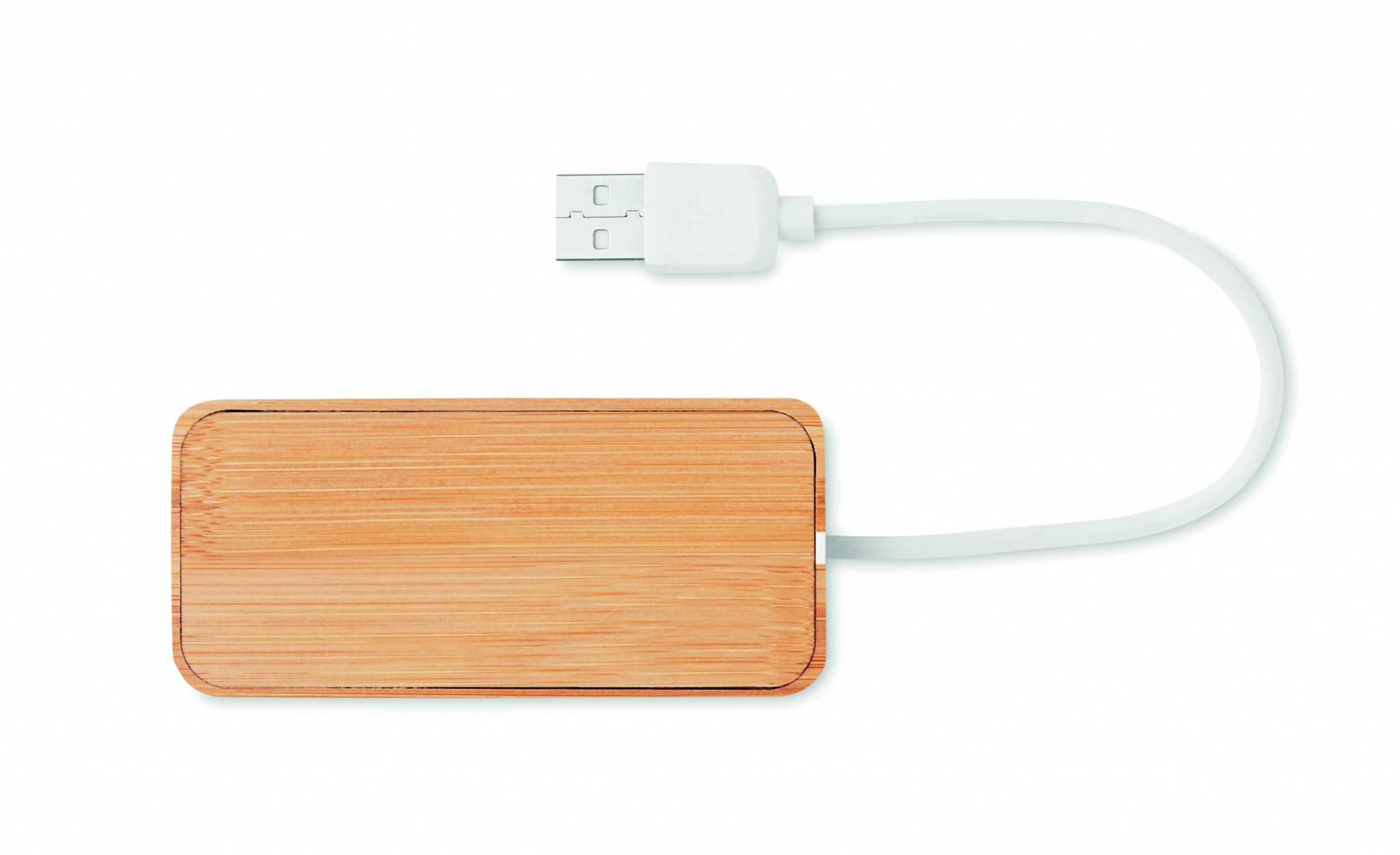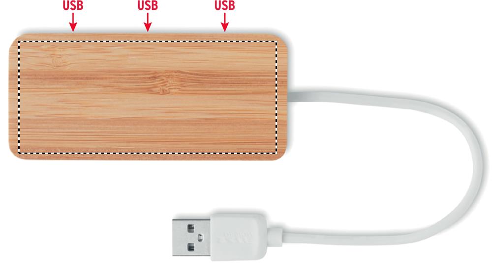 3 port 2.0 USB hub in bamboo case. Cable length 18,5 cm. Bamboo is a natural product, there may be slight variations in colour and size per item, which can affect the final decoration outcome.