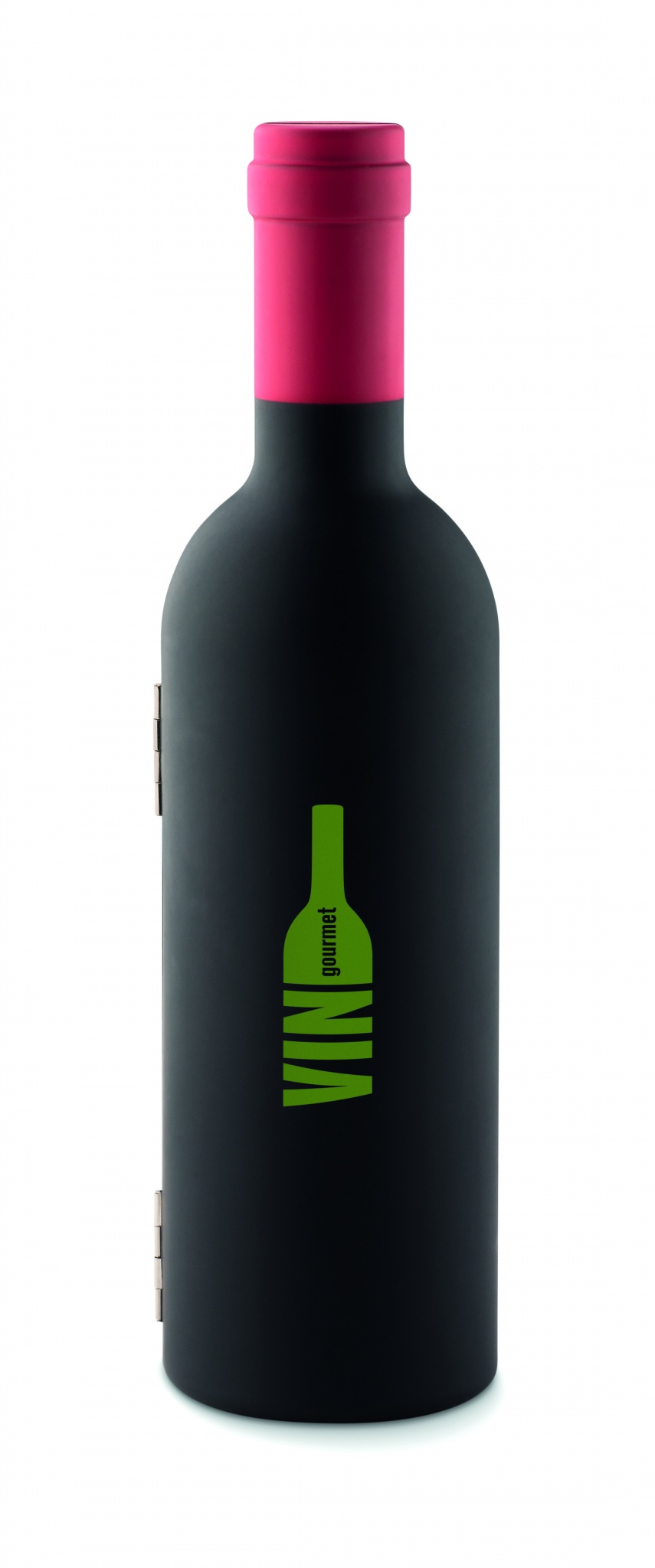 Wine set presented in bottle shaped box. With wine stopper, corkscrew and anti drip collar. Magnetic closing.