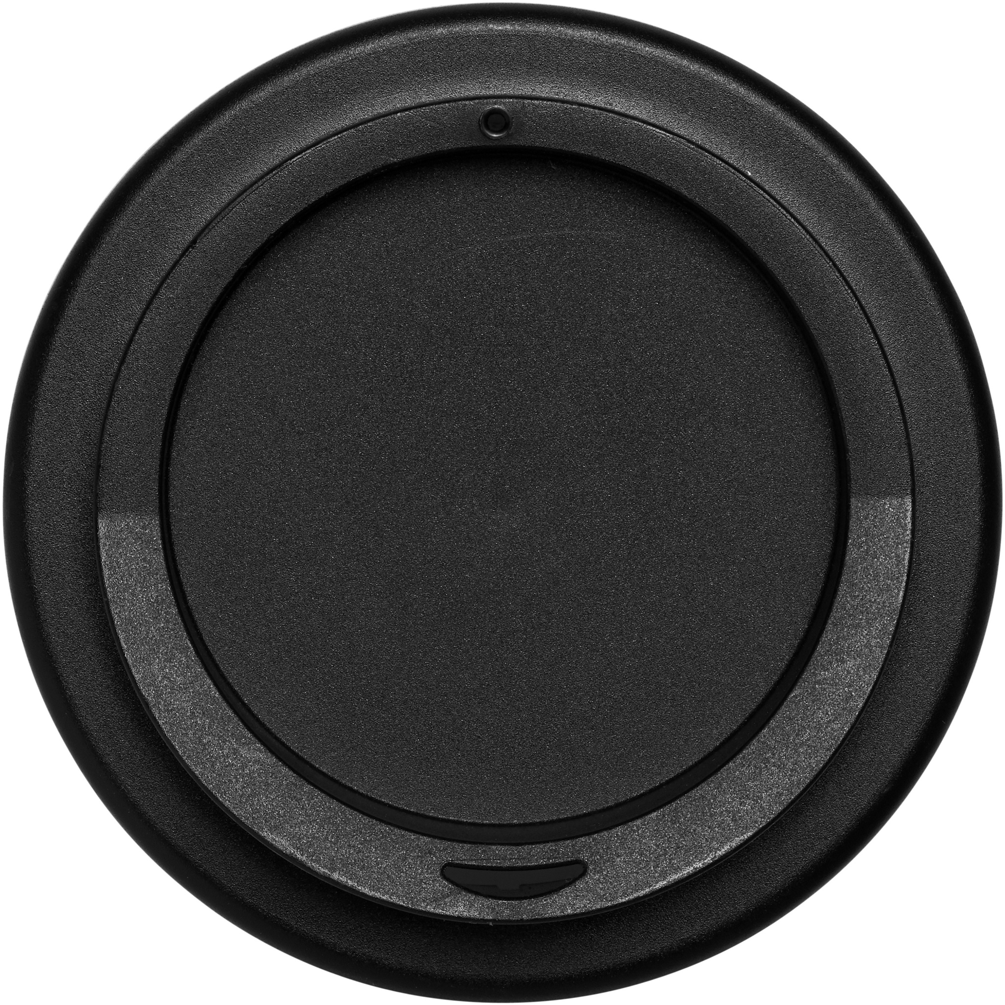 Double-wall insulated tumbler with a twist-on lid and full colour wraparound design moulded to the product. Made from 95% recycled plastic and has a black inner layer. The mug is fully recyclable, and dishwasher and microwave safe. 350 ml volume capacity and BPA free. Packed in a home compostable bag. Made in the UK.