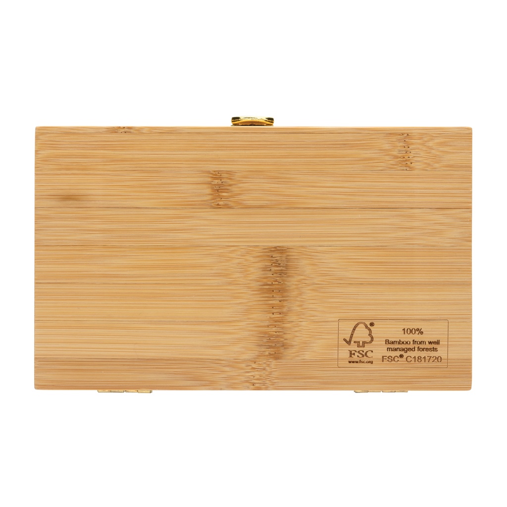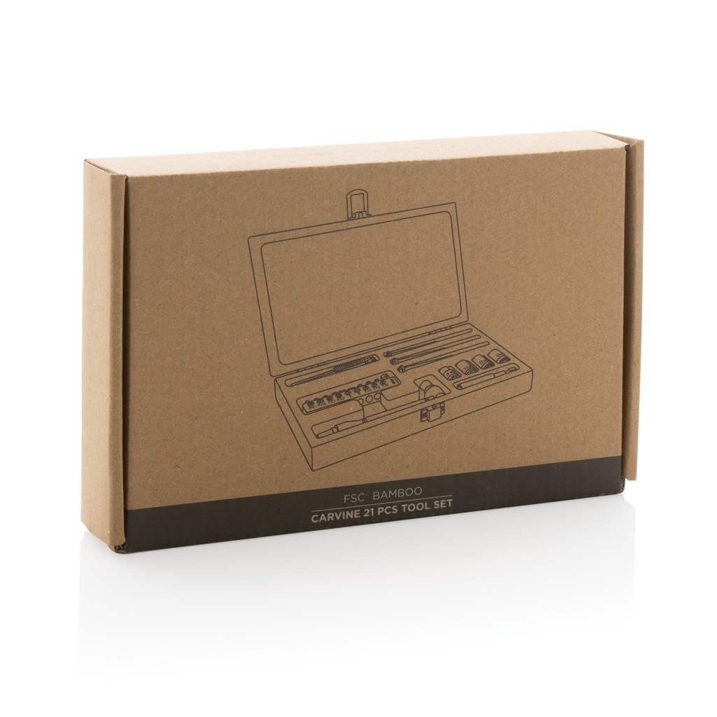 Tool set with 21 pcs in luxury FSC® 100% bamboo case. The set contains 3 screwdrivers, 10 bits in holder, 4 sockets, 1pc handle, 1pc connector, 1pc small cutter. Packed in FSC® mix kraft packaging