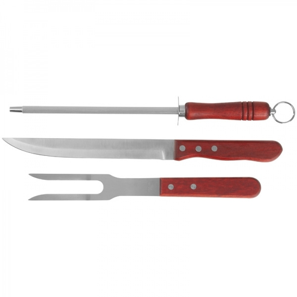 Classy carving knife and fork composed of a carving knife, a fork and a blade sharpener. Packed in a nice wooden box. Your logo will be printed on the wooden box.