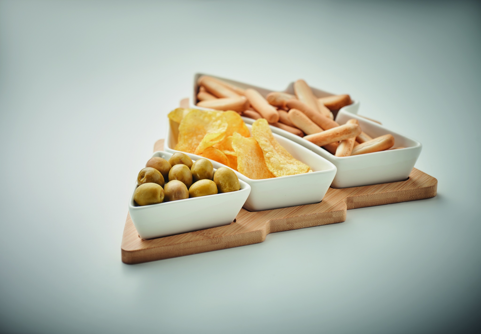 Tree-shaped bamboo serving platter with three ceramic serving dishes. Bamboo is a natural product, there may be slight variations in colour and size per item, which can affect the final decoration outcome.