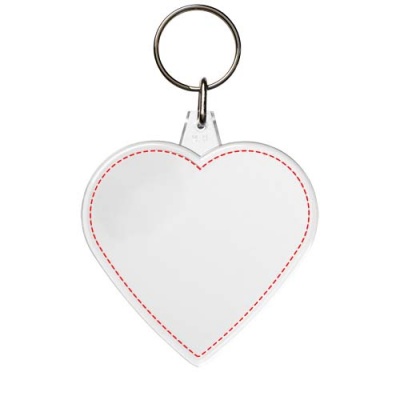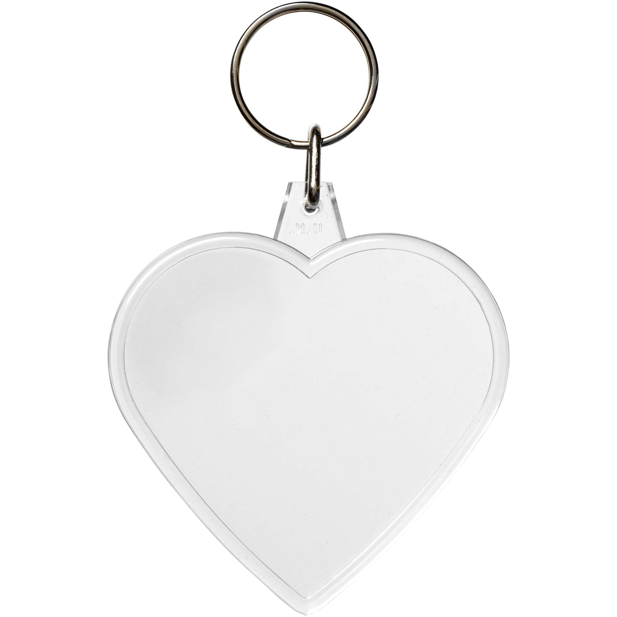Clear heart-shaped keychain with metal split keyring. The metal looped ring offers a flat profile which is ideal for mailings. Print insert dimensions: 5,8 cm x 5,0 cm.