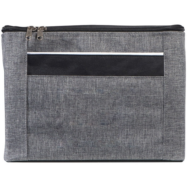300D+600D polyester cooler bag with carrying handle, zipper closure, space for six 500ml cans or bottles and a front compartment printed with your logo.