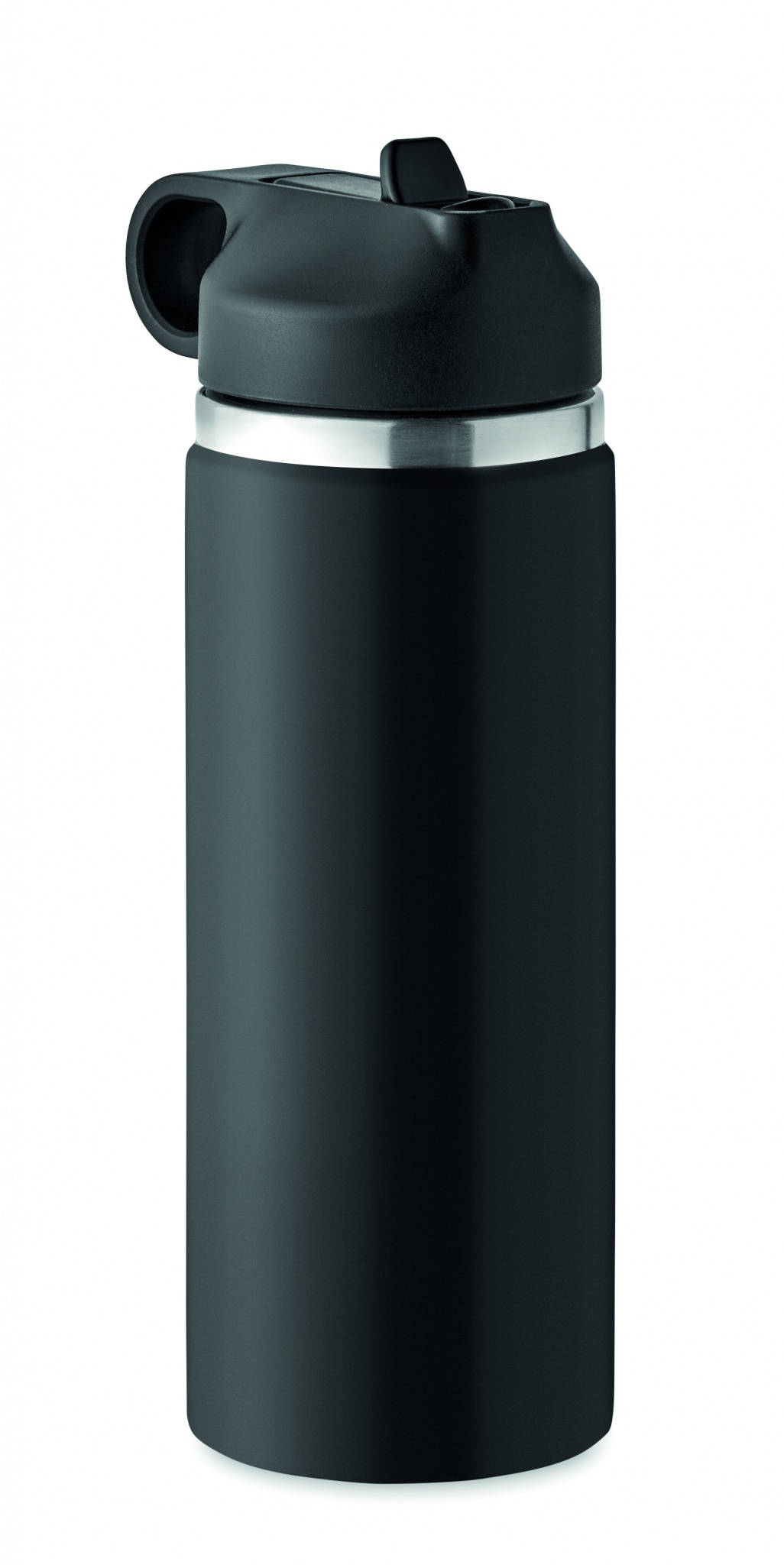 Double wall recycled stainless steel (90% recycled stainless and 10% stainless steel) insulated vacuum bottle with grip handle lid in PP and integrated straw built-in straw cap. Leak-free. Capacity: 500 ml.