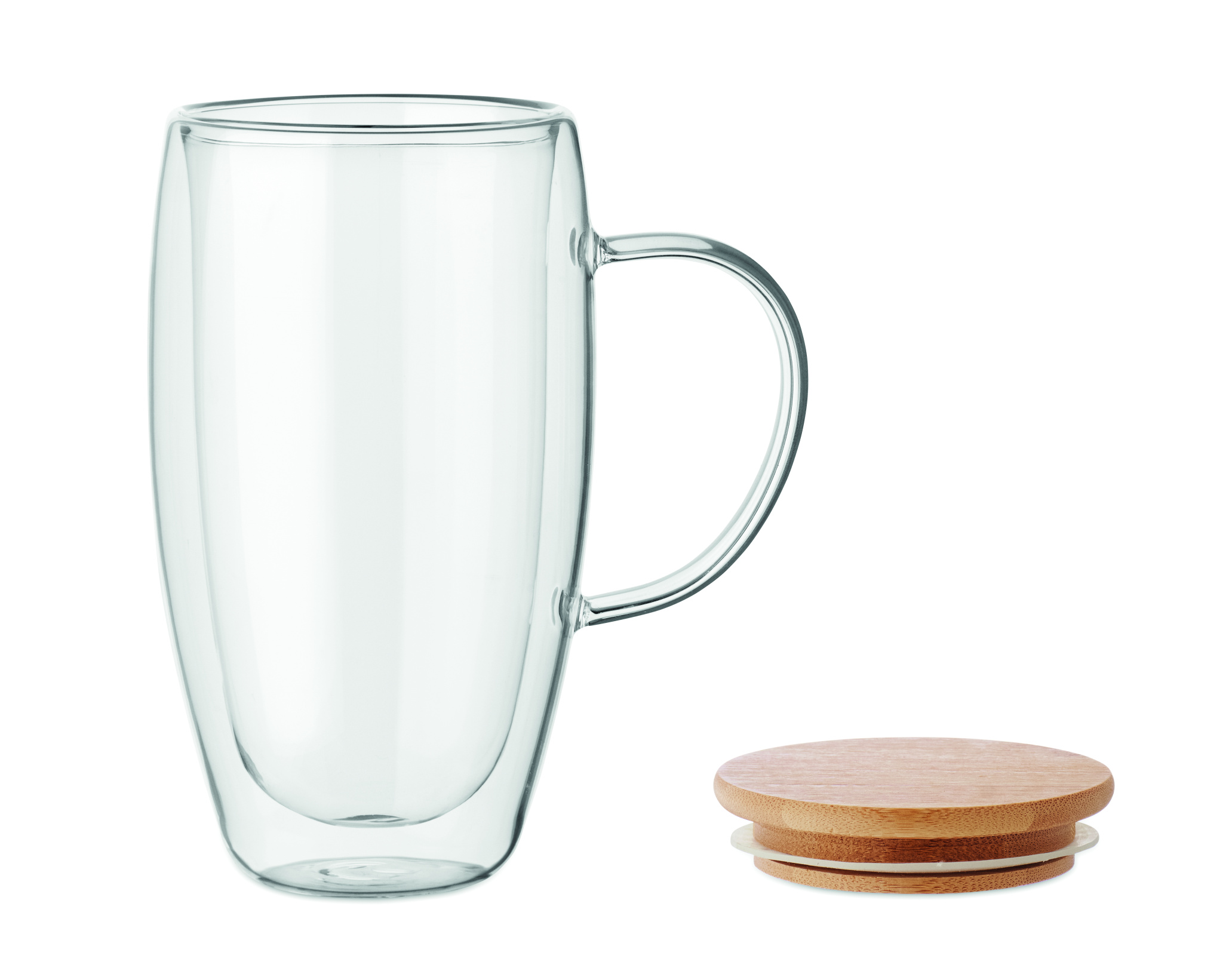 "Double wall borosilicate glass mug with handle and bamboo lid. Capacity: 450 ml."