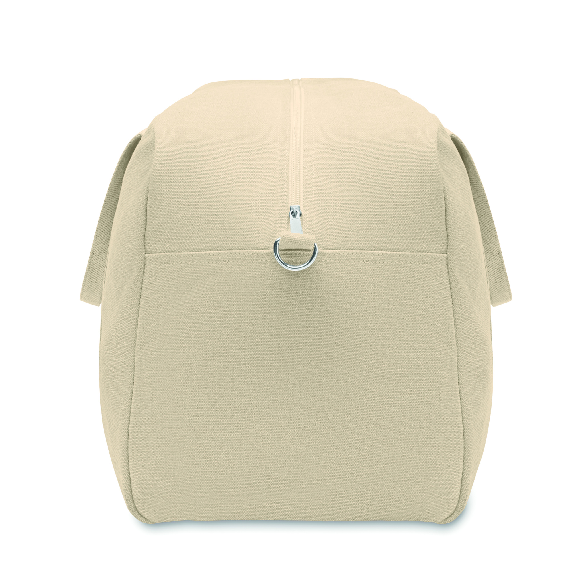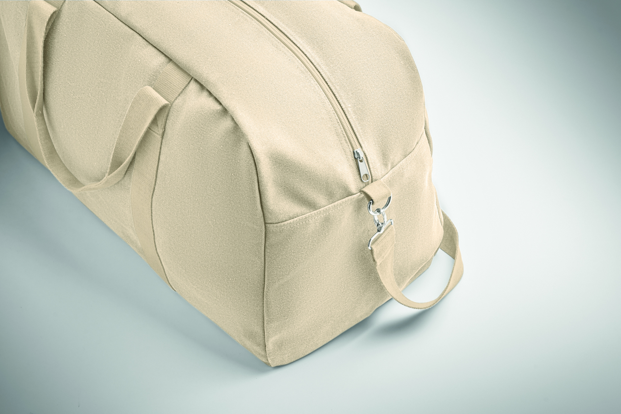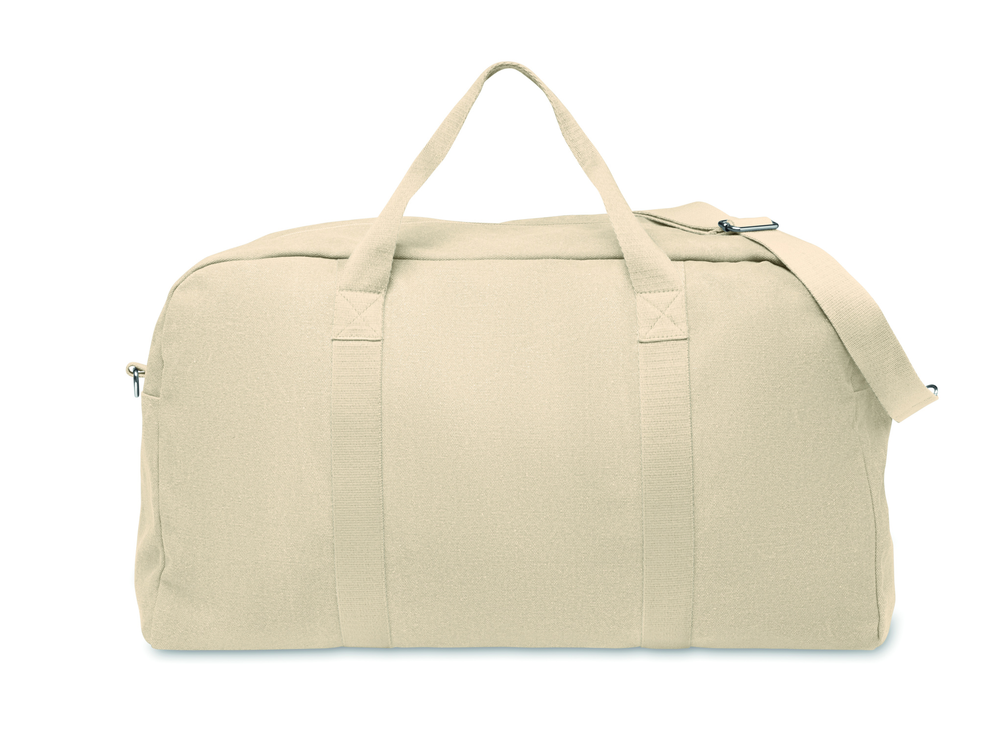 Duffle travel bag in recycled 450 gr/m² fabrics (60% recycled cotton and 40% recycled polyester) with adjustable and detachable cotton strap.