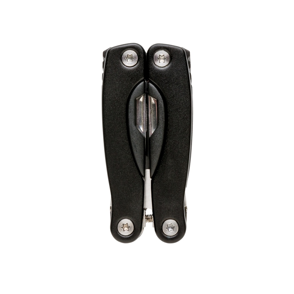 Aluminium multitool, handle with black details, 14 functions, packed in black 600D pouch.