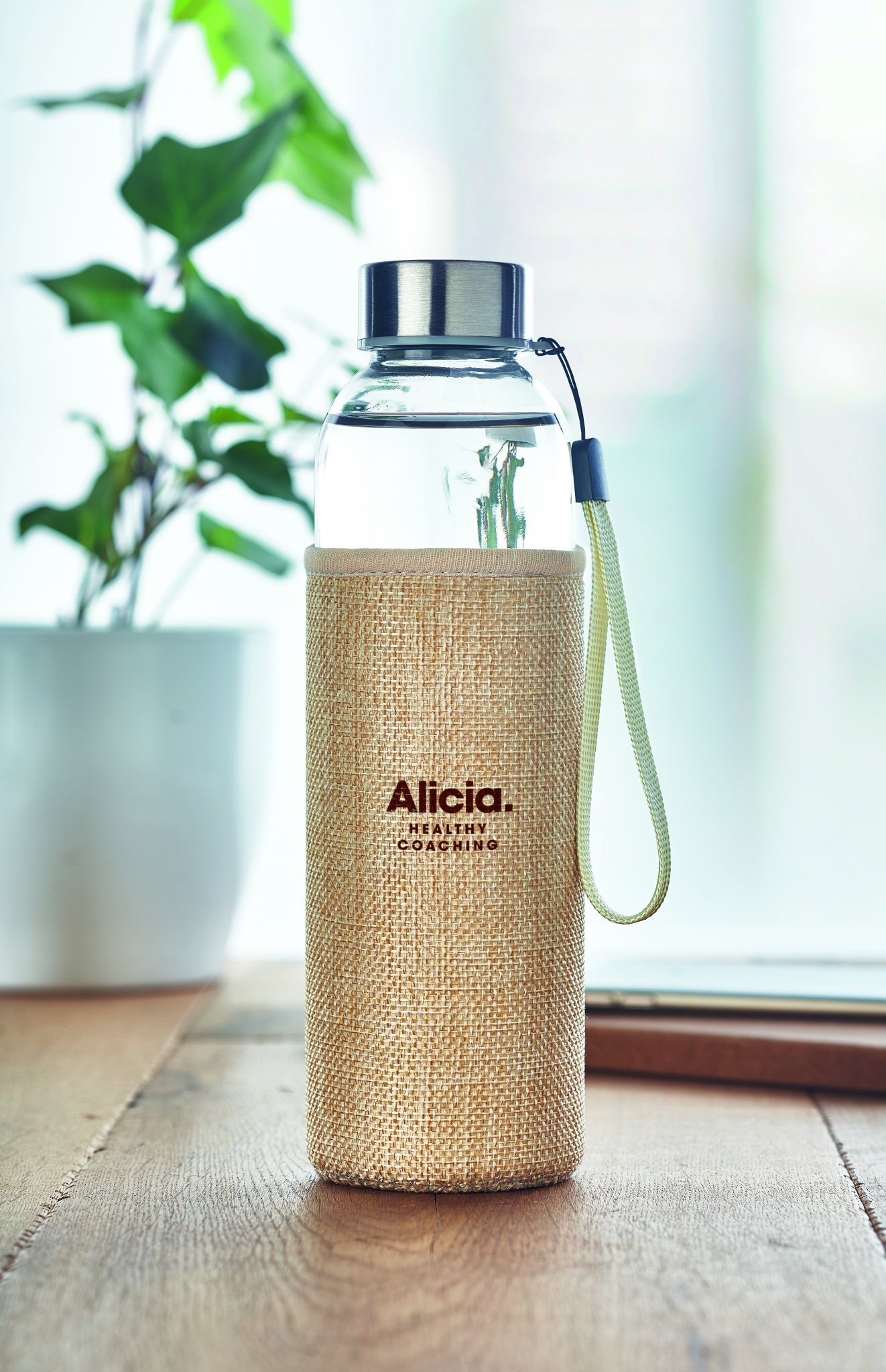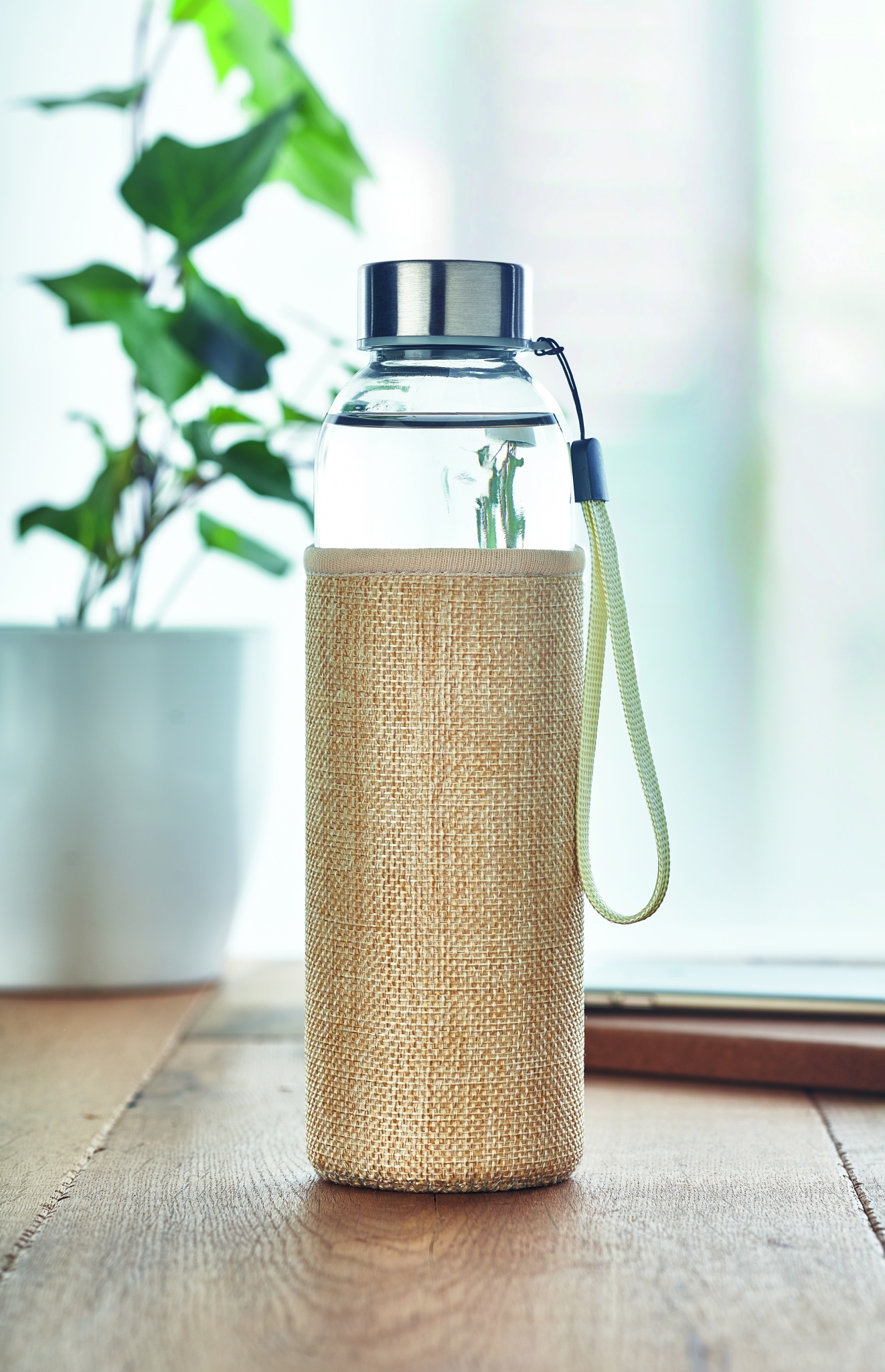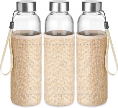 Drinking bottle in glass with neoprene style and jute mixed material pouch. Capacity: 500 ml. Not suitable for carbonated drinks. Leak free.