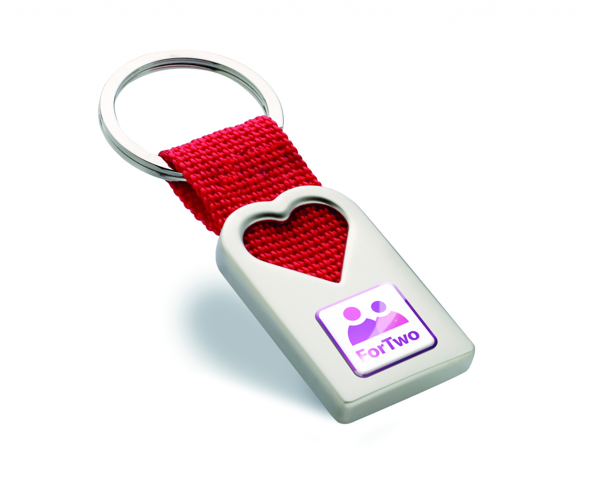Metal key ring in matt pearl finish in hollow heart shape decoration with polyester webbing holding the metal ring. Individual gift box.