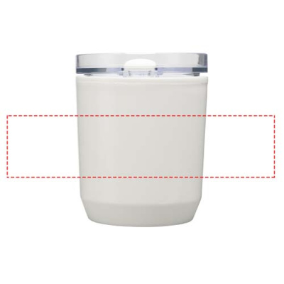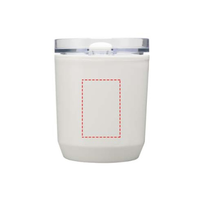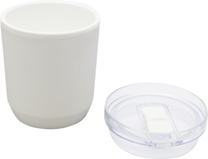Tumbler with a simple design that fits most coffee machines and car cup holders. Features a double wall construction with a recycled PP plastic exterior and a PP plastic interior. The sliding lid is made from AS and PP plastic. Volume capacity: 180 ml.