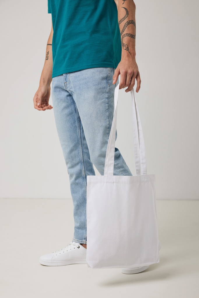 No greenwashing, but telling a true story about sustainability! This Impact collection is made with AWARE™ tracer. With AWARE™, the use of genuine recycled fabric materials and water reduction impact claims are guaranteed by using the AWARE disruptive physical tracer and blockchain technology. Save water and use genuine recycled fabrics. A regular cotton tote uses 1200 litres of water. AWARE™ Recycled cotton requires almost zero water! With the focus on water 2% of proceeds of each Impact product sold will be donated to Water.org. Carry your essentials inside this casual tote bag made with 100% recycled materials with AWARE™ tracer. This tote bag (330 g/m2) features a simplistic design with two top handles that can be carried on the shoulder or by hand. A truly sustainable and reusable bag for everyday use.
