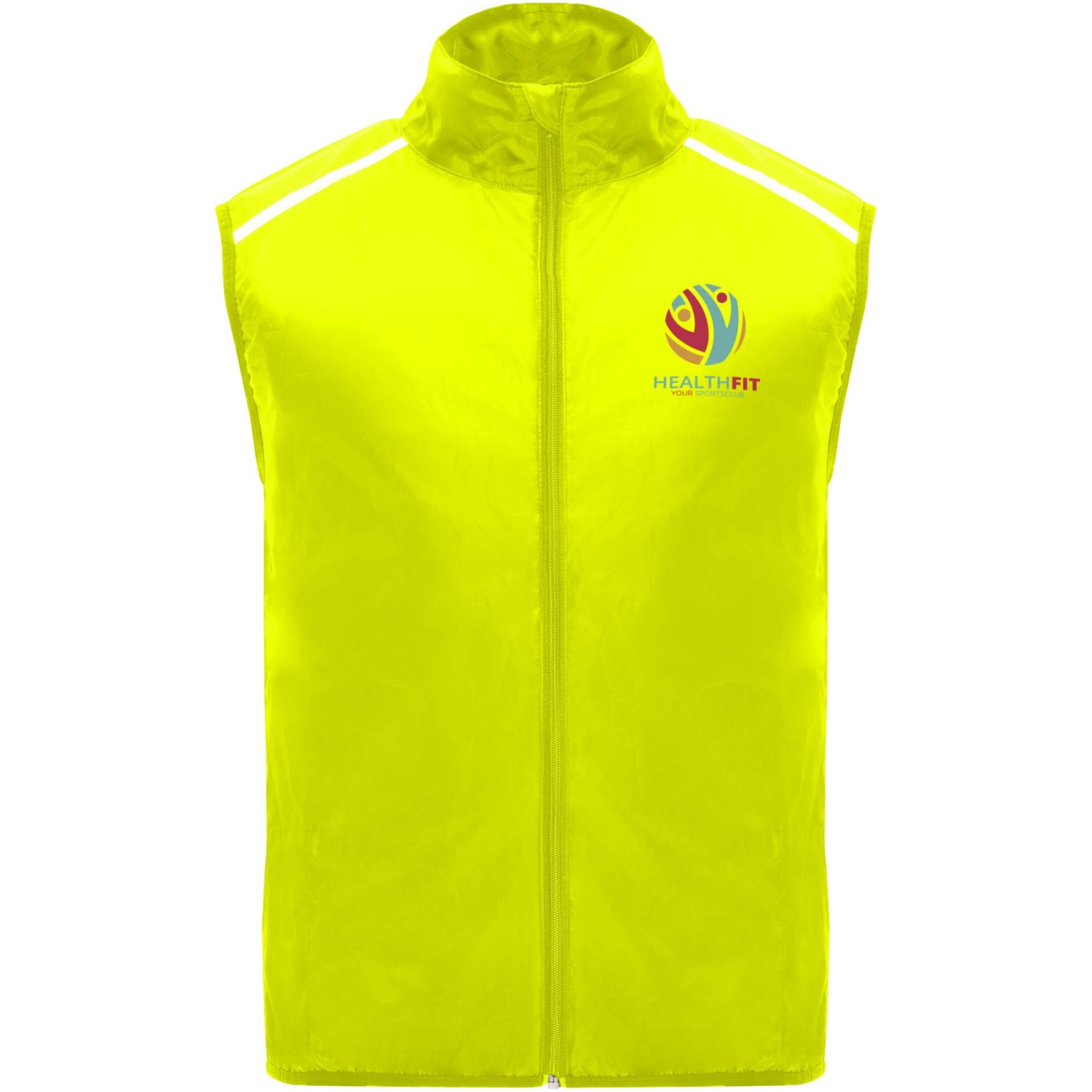 Wind-proof and breathable. Front zip with matching chin protector. Elastic binding at armhole and bottom. Bottom part of the back in microperforated fabric. High-visibility details on the top, front and back. Pocket with elastic strap to stow the vest and wear it on the wrist. Removable label.