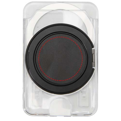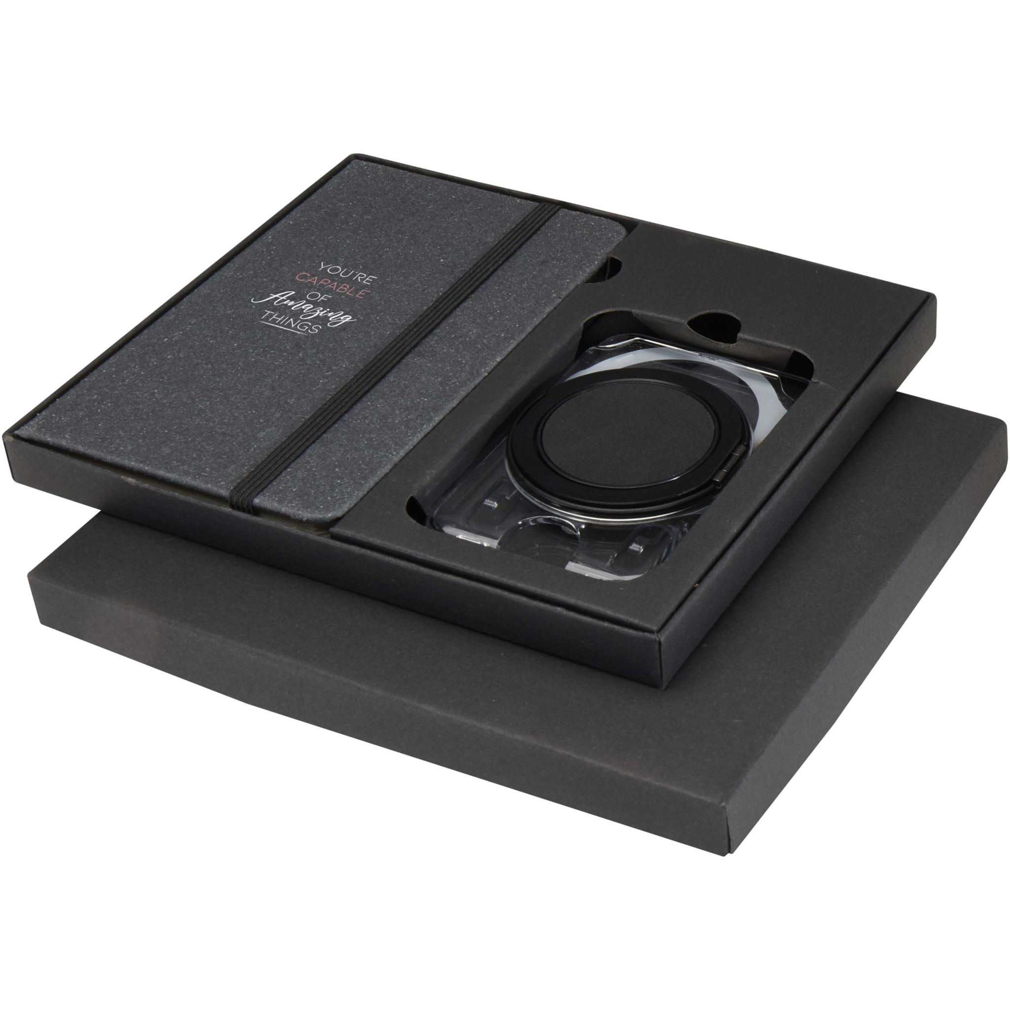 A practical gift set featuring an A6 notebook and MagSafe wallet. The notebook has a dark grey recycled plastic cover, 80 lined cream-coloured sheets of 70 g/m² paper, and a black elastic closure. The transparent MagSafe wallet holds one card and attaches magnetically to iPhone 12 or newer models, and also comes with an extra metal ring for use with other phones. Both items are presented in a sleek black cardboard gift box.