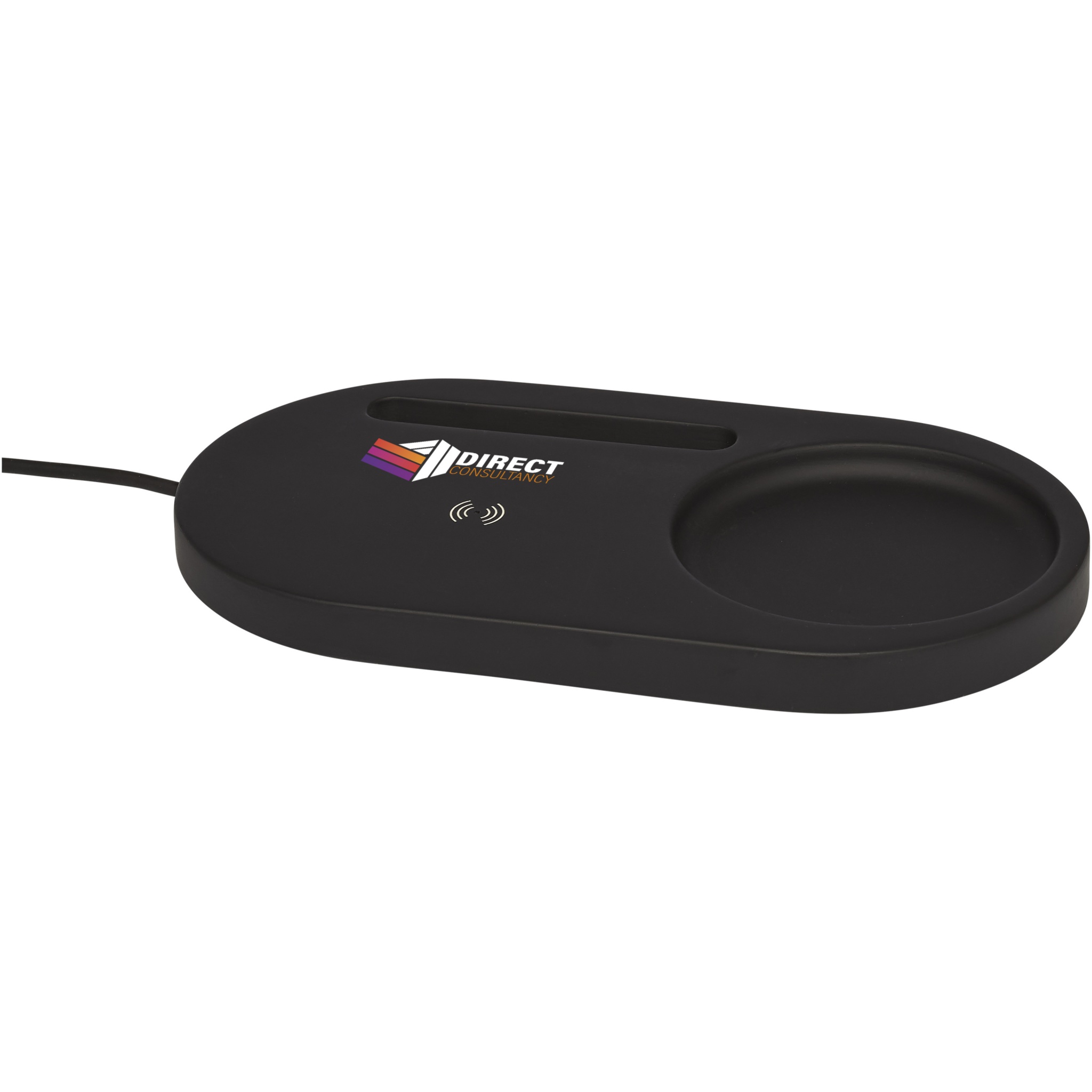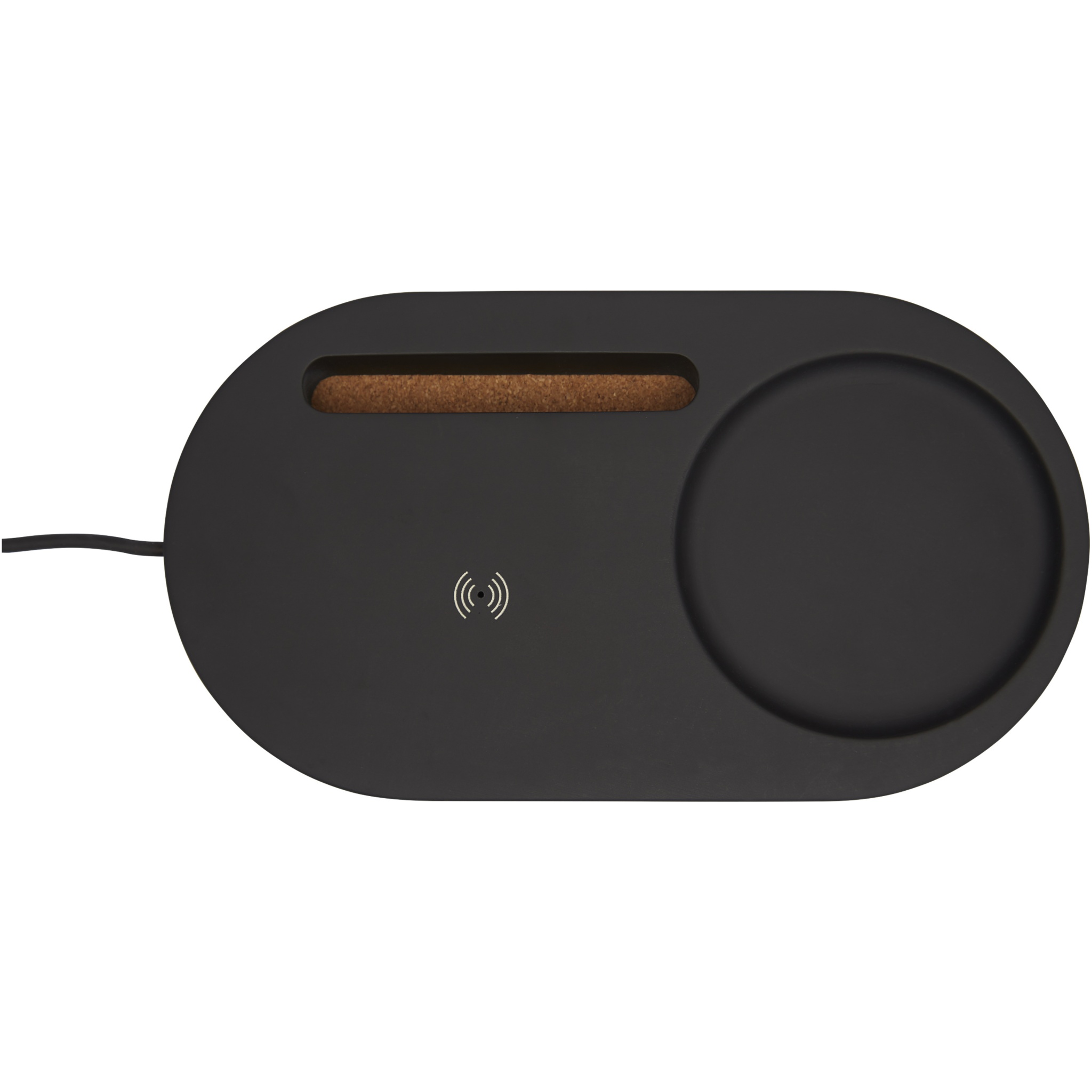 5W wireless charging desk organizer made of a combination of natual limestone and cork. To charge a device without wireless technology, an external wireless charging receiver or receiver case is required. Packaged in a gift box and delivered with an instruction manual (both made of sustainable material). Includes a 100 cm USB cable.