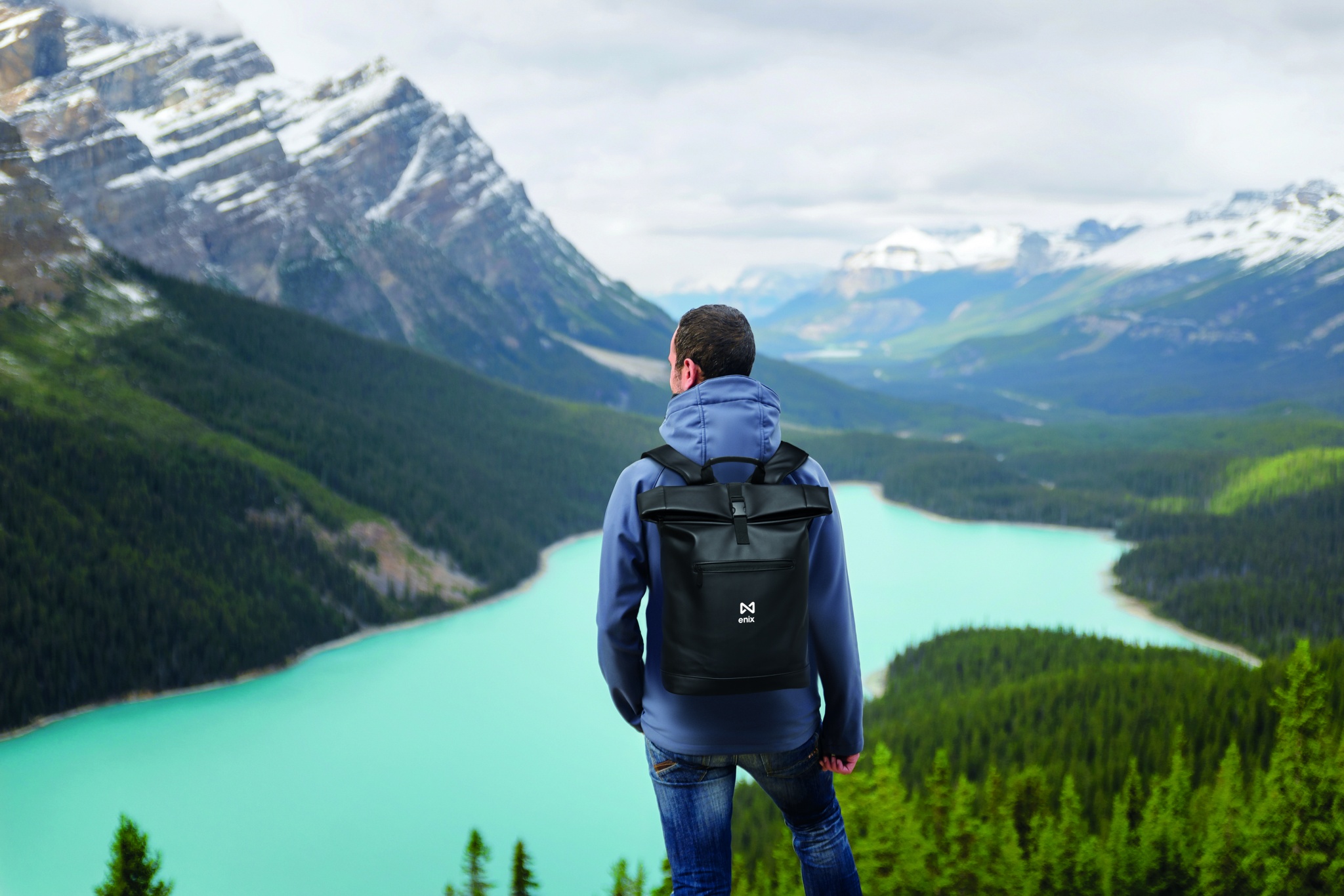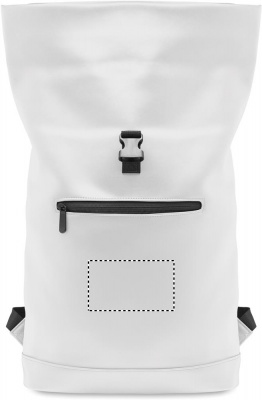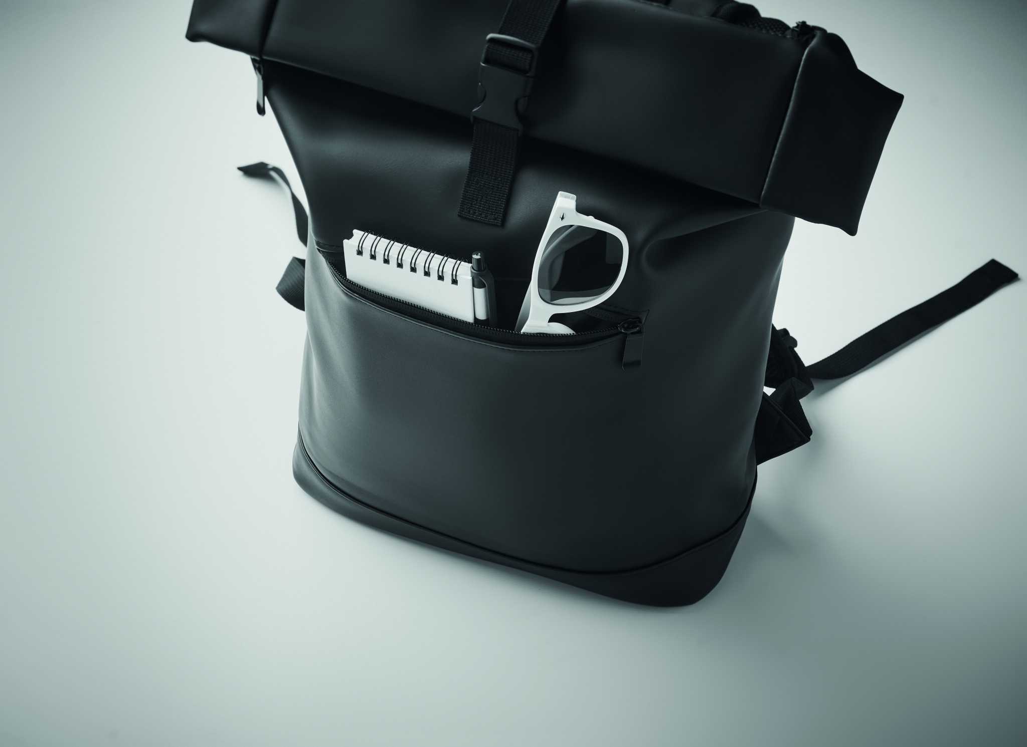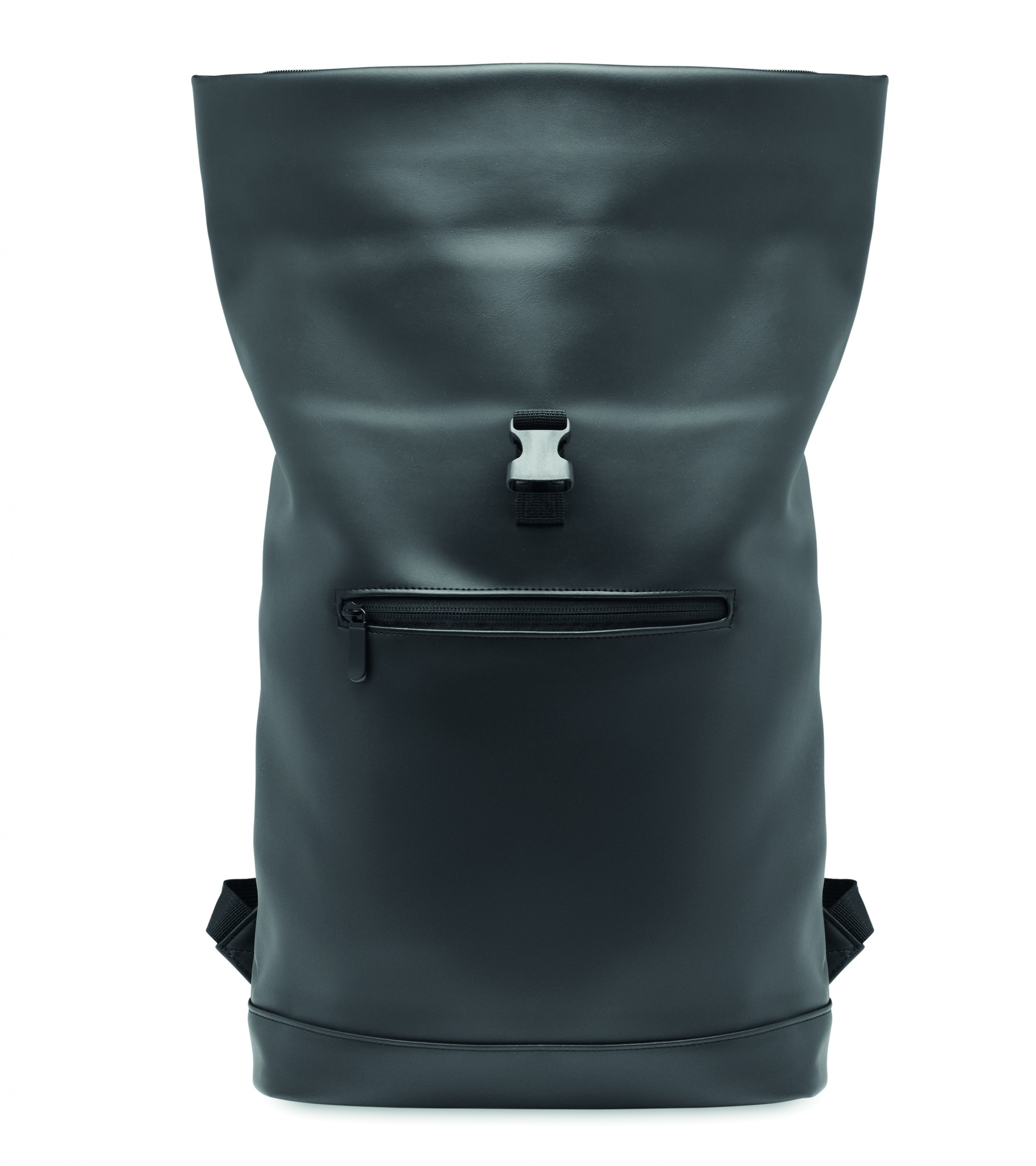 15 inch rolltop laptop backpack in soft PU with padded back and reinforced base. Large front zipped pocket. The lining is 210D RPET.