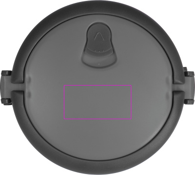 Perfect for lunch, box in stainless steel with two compartments and plastic carrying handle. We print your logo on the lid.