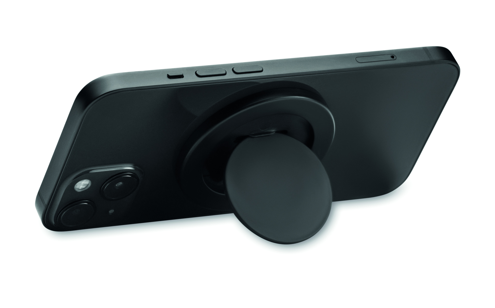 Magnetic phone holder and stand in recycled ABS. Includes additional metal ring to support non-magnetic phones.