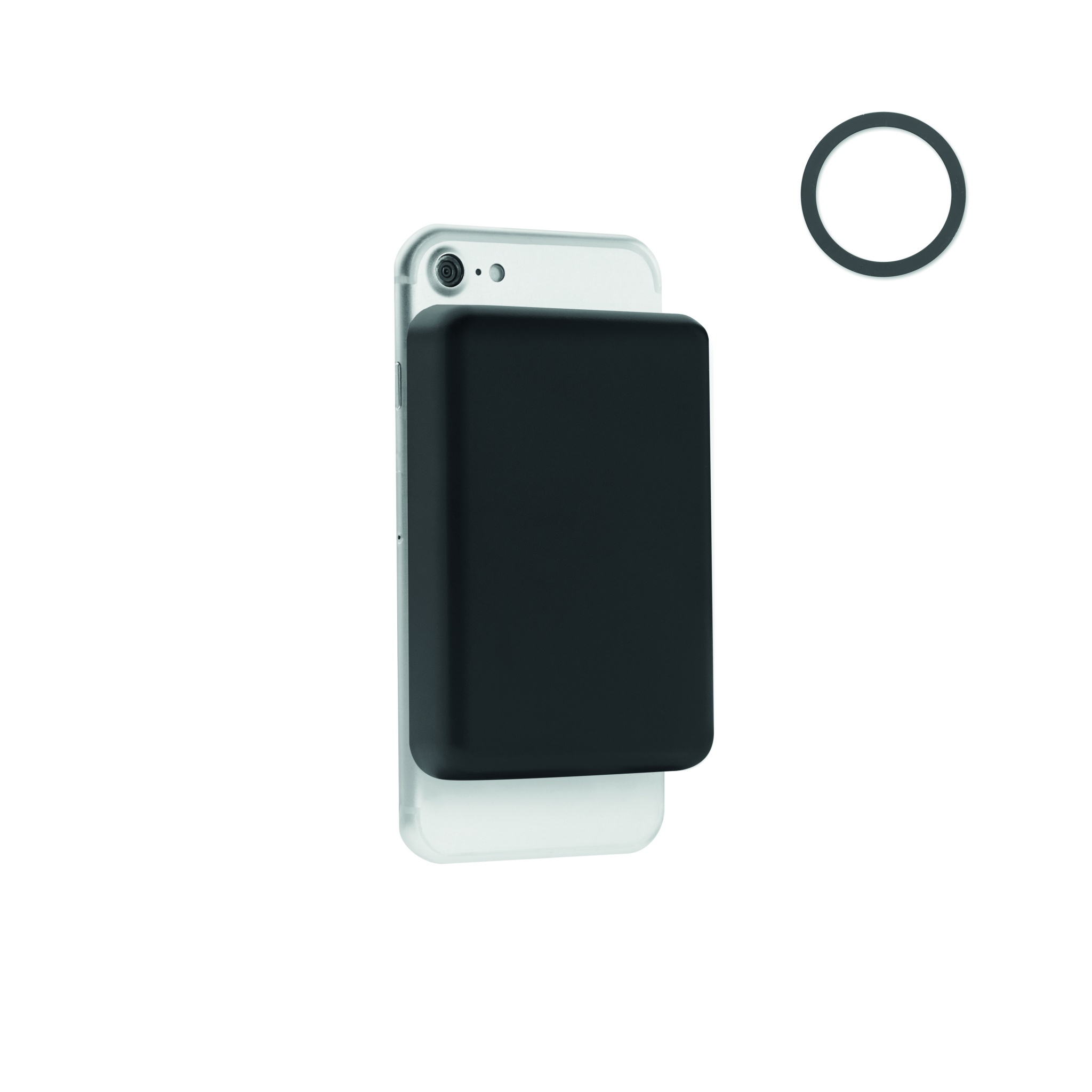 Magnetic wireless charger (15W) and power Bank (5000 mAh). Output: DC 9V/1.66A (18W) ideal for quick charging. Compatible with iPhone® 12 and newer. Including additional magnetic metal ring to support charging of other non-magnetic wireless chargeable phones. In/Output: Type-C. Power delivery (PD) support to charge the newest laptop MacPro®.
