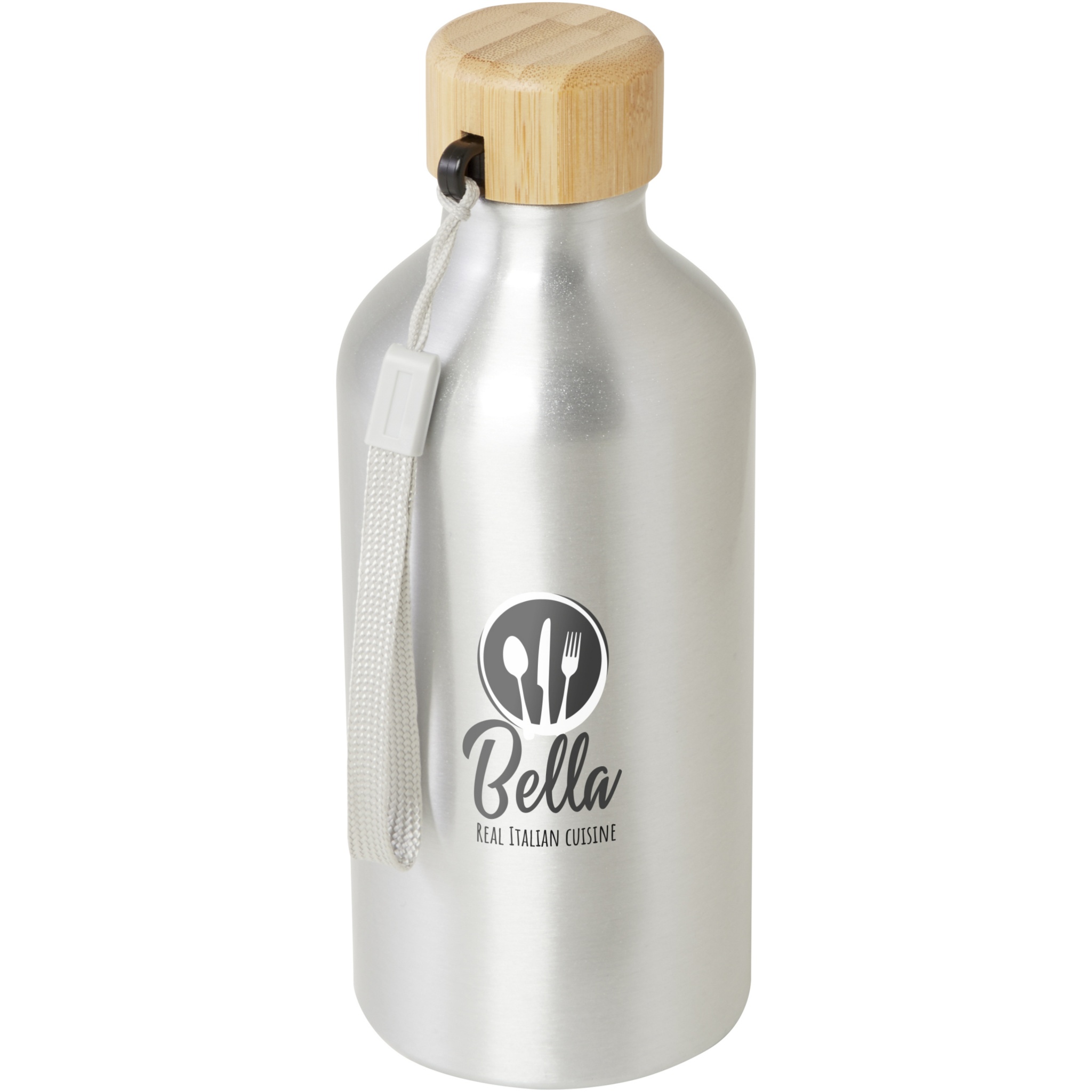 RCS certified recycled aluminium water bottle with a stylish bamboo lid. This lightweight, single-walled bottle comes with a strap for easy carrying. The bamboo is from sustainable, environmentally and socially responsible sources. Capacity is 500 ml. Hand wash only.