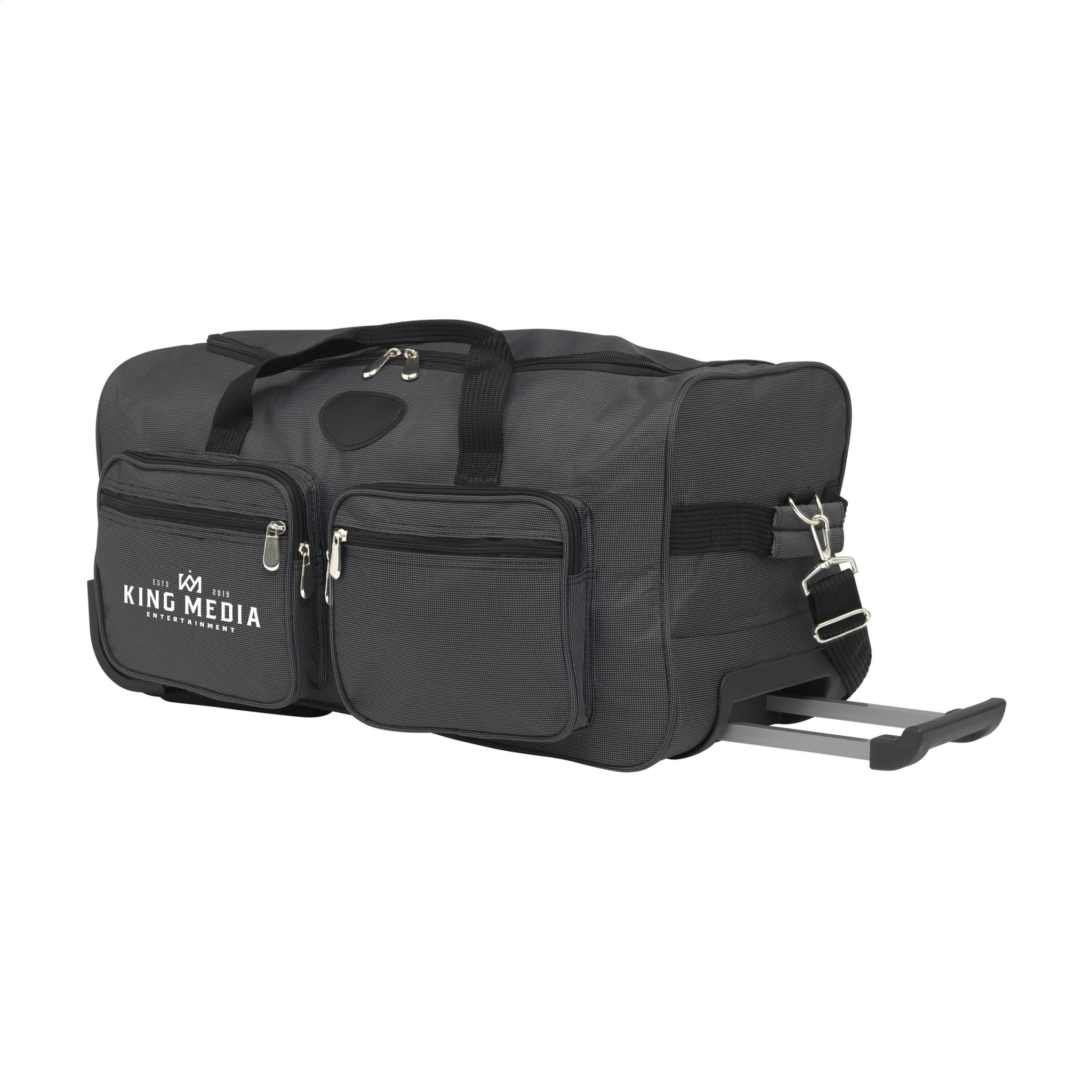 Exclusive luggage trolley bag with a telescopic handle, 2 wheels, a large main compartment and 4 front pockets with zips. Made from water repellent, duo-tone 600D polyester with a chic yet subtle checkered finish. Capacity approx. 31.5 litres.