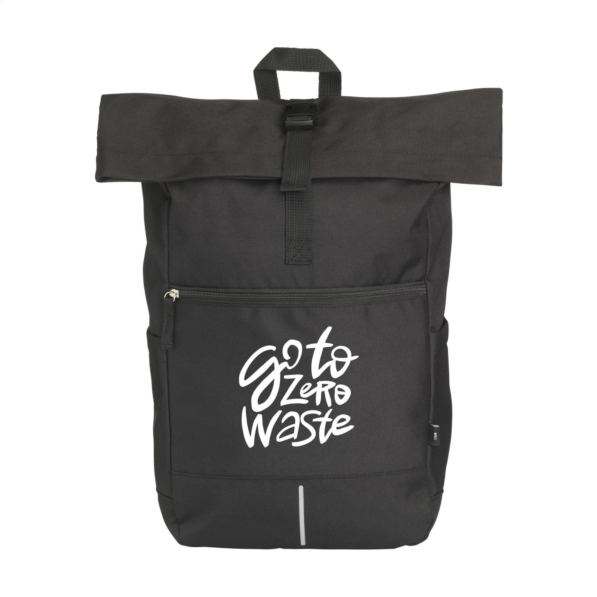 WoW! Practical, sturdy and water-resistant urban ‘roll-top’ backpack made from RPET Polyester (made from recycled PET bottles). The backpack has a large inner compartment with a special laptop compartment (up to 15.6”). Zipper pocket on the front with a reflective highlight below it (improving visibility in the dark). With 2 side pockets, foam back and padded, adjustable shoulder straps for increased wearing comfort, carrying strap and handy roll closure with click system at the top. Capacity approx. 20 litres.