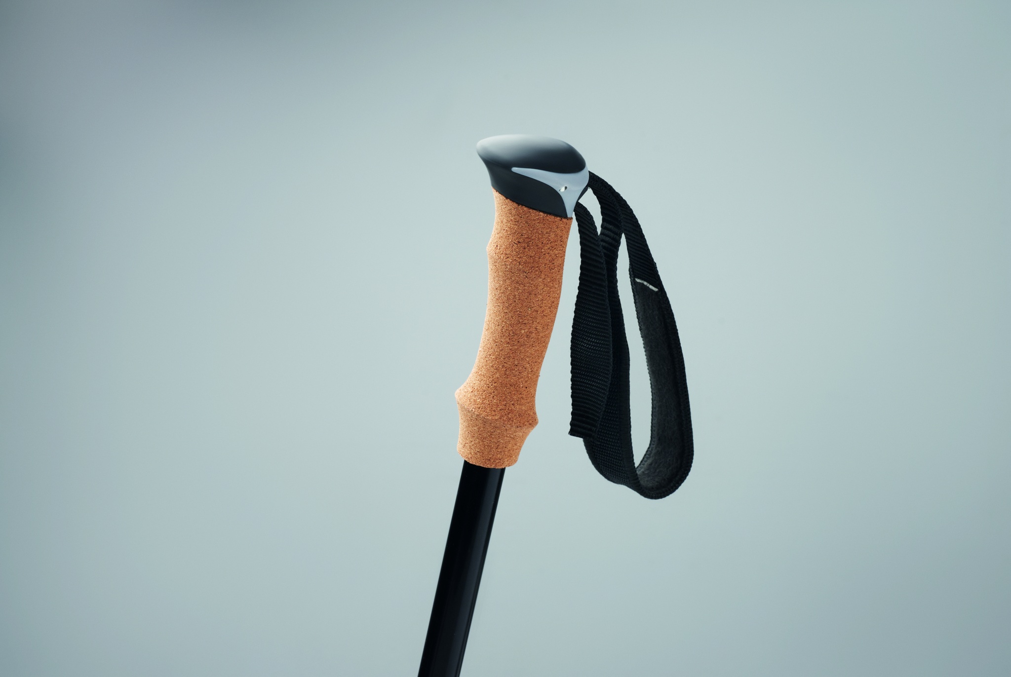 Fully adjustable nordic walking poles in aluminium with cork handles, walking rubber tips and mud baskets. Presented in a RPET ripstop pouch. Fully adjustable: 65cm to 135cm.