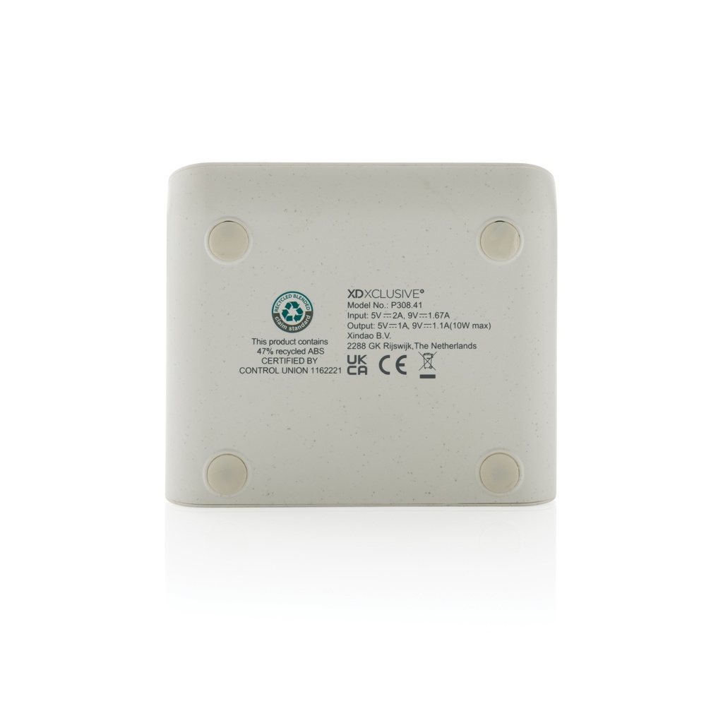 10W fast wireless charger made with RCS (Recycled Claim Standard) certified recycled ABS. Total recycled content: 47% based on total item weight. RCS certification ensures a completely certified supply chain of the recycled materials. Bamboo wireless charging area made from FSC 100 bamboo. With two USB ports on the back to charge via cable. The stand is designed to charge your phone both in the horizontal and vertical position. Making it perfect to watch videos or other content while charging. Wireless charging compatible with Android latest generations, iPhone 8 and up. Item and accessories PVC free. Including 120 cm type C charging cable made from RCS certified recycled TPE. Packed in FSC mix kraft box. Type-C Input 5V/2A; 9V/2A; Wireless output 5V/1A;9V/1.1A; (10W) Registered design®