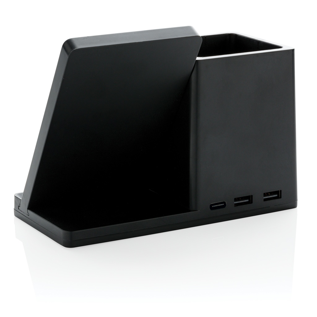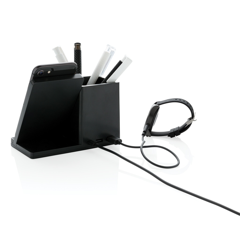 10W fast wireless charger with pen holder made with RCS (Recycled Claim Standard) certified recycled ABS. Total recycled content: 78% based on total item weight. RCS certification ensures a completely certified supply chain of the recycled materials. Bamboo wireless charging area made from FSC 100 bamboo. With two USB ports on the back to charge via cable. Wireless charging compatible with Android latest generations, iPhone 8 and up. Item and accessories PVC free. Including 120 cm type C charging cable made from RCS certified recycled TPE. Packed in FSC mix kraft box. Type-C Input 5V/2A; 9V/2A; Wireless output 5V/1A;9V/1.1A; (10W) Registered design®